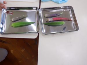 実験に使ったオクラを触ったり、匂いをかいでみたり・・・様々な発見がありました。