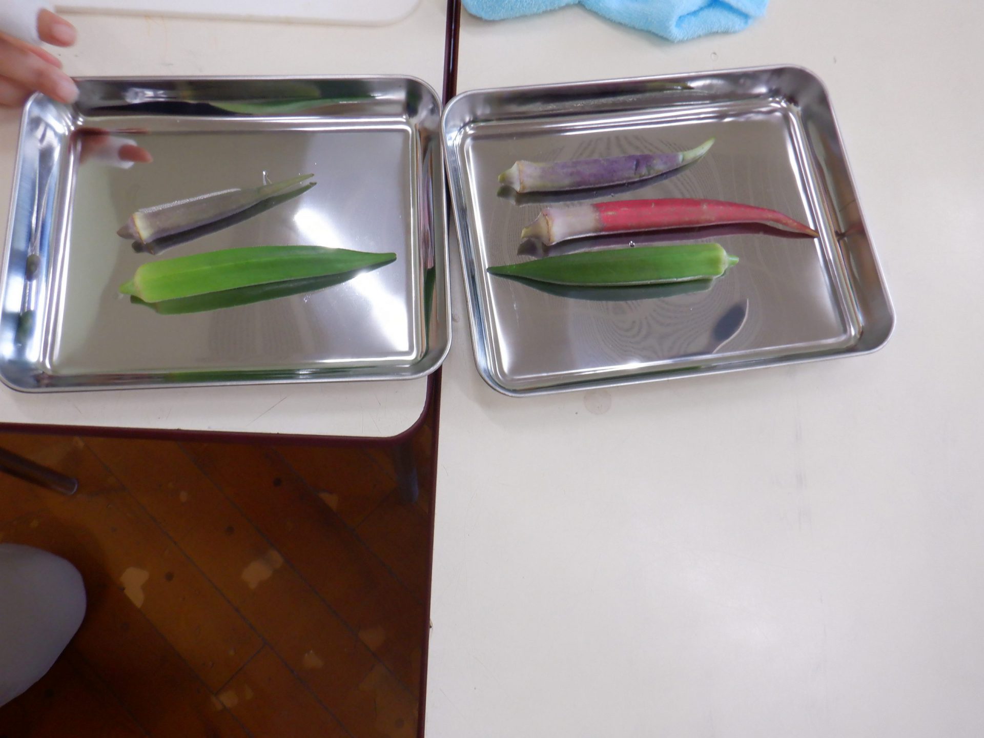 年長児が自分たちで育てている赤いオクラを給食室に届けても給食に出てこないのはなぜ・・・?という子どもたちの疑問からオクラがどうなっているのかを調べてみることにした。日頃から給食によく使われ子どもたちがよく知っている緑のオクラも一緒に切ったり、茹でたりして違いを見ることができて、赤いオクラも給食に入っていたことが分かった。