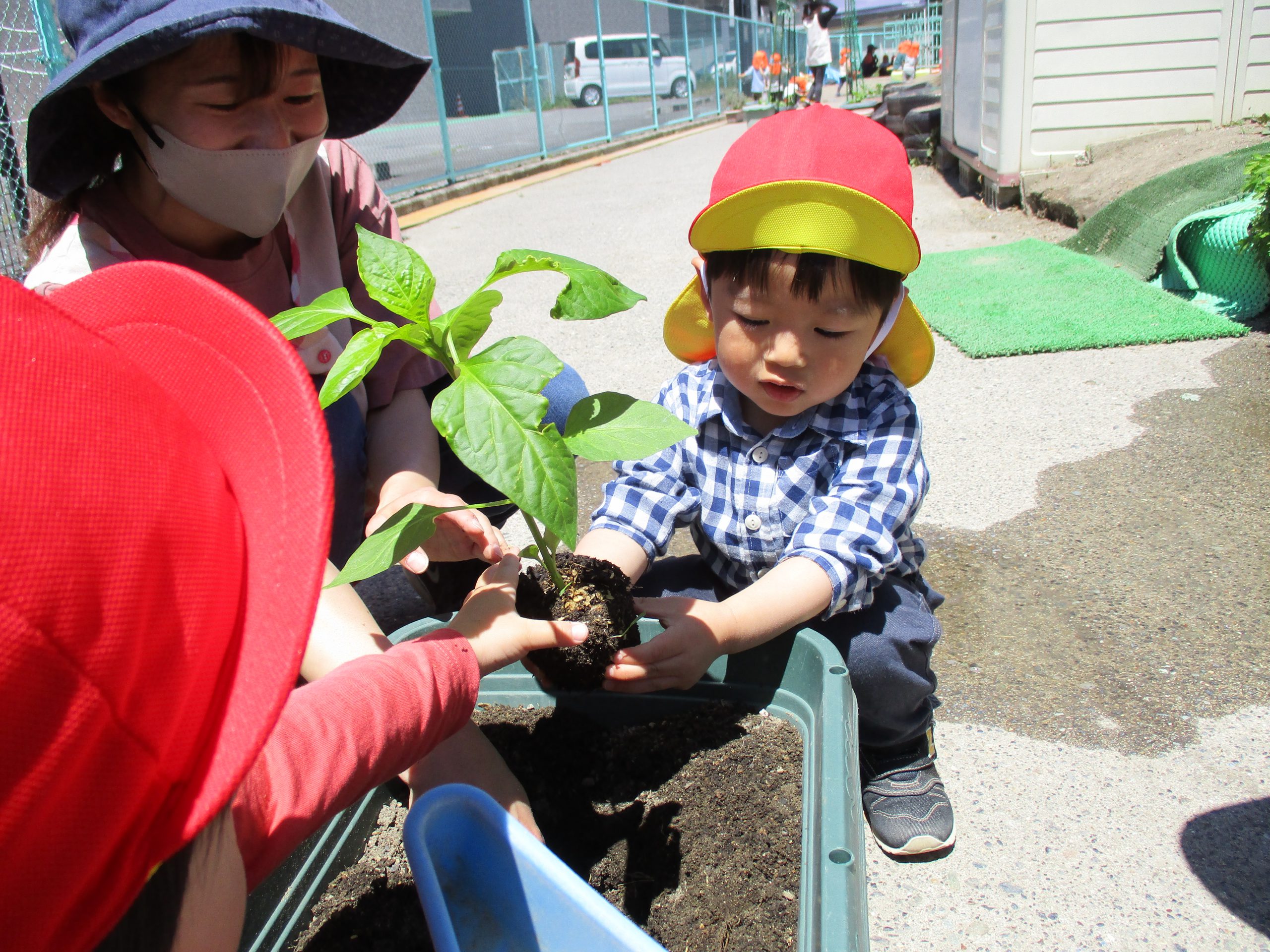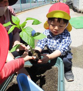 そーっとね。と保育士が言うと、良く聞いていて「そーっと、そーっとだよね。」と、大事に苗を置く子どもの姿がありました。