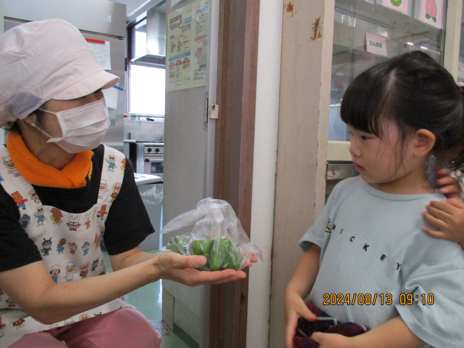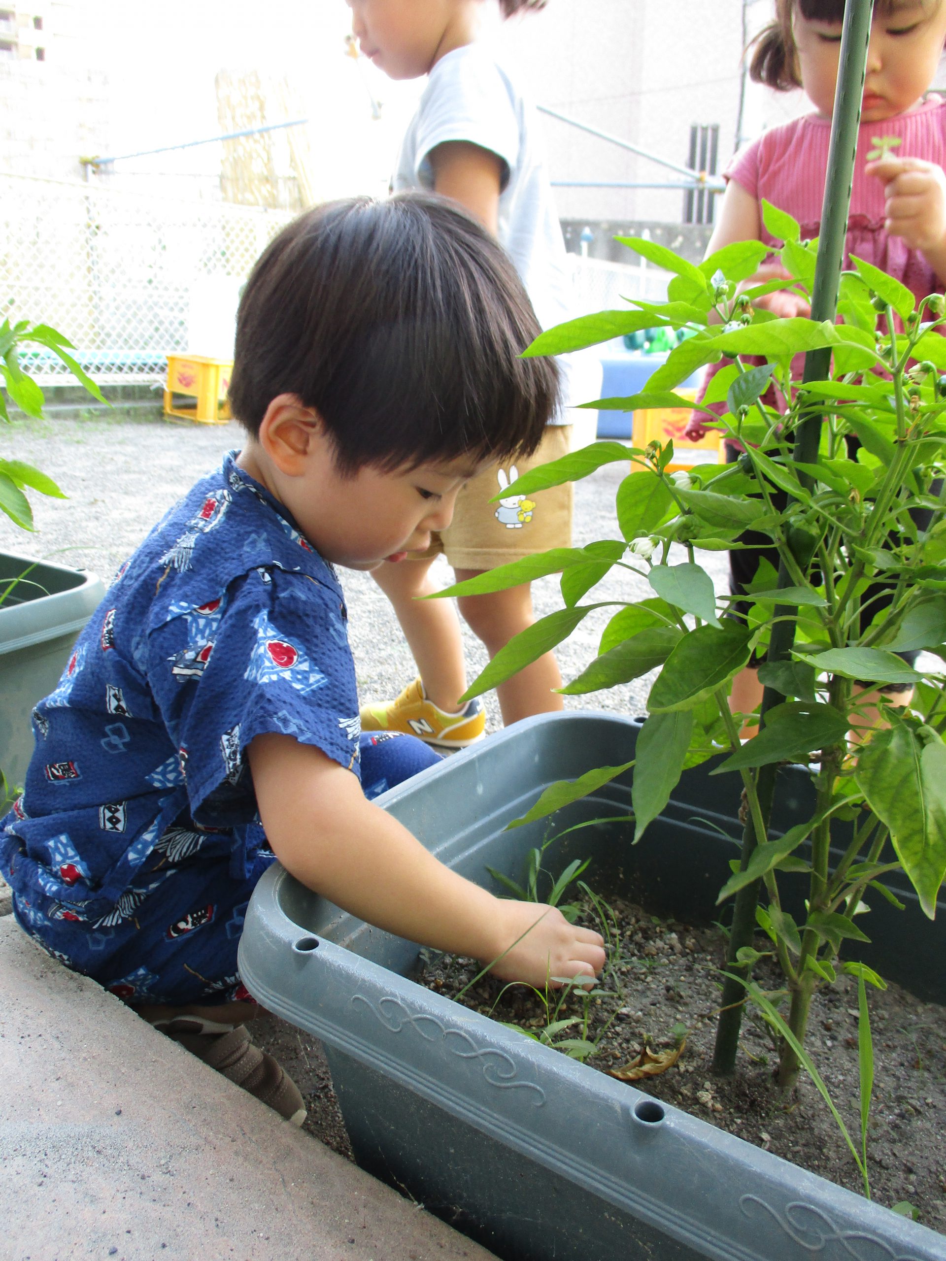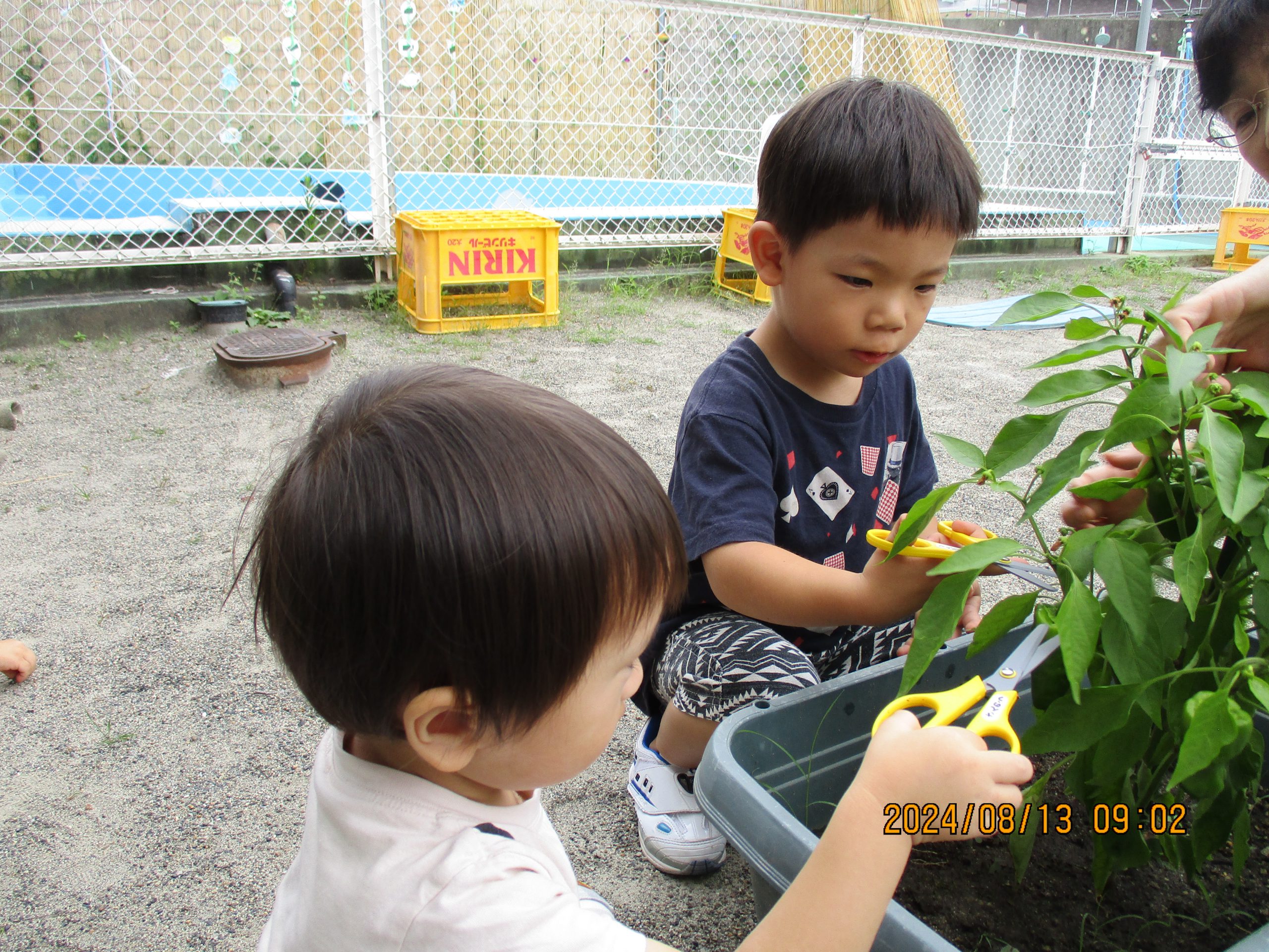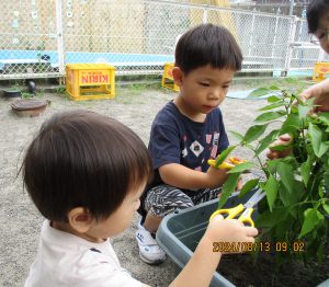 「ピーマンのお花、かわいい!白い花!」と、気付いて観察しながら、意欲的に取っていました。