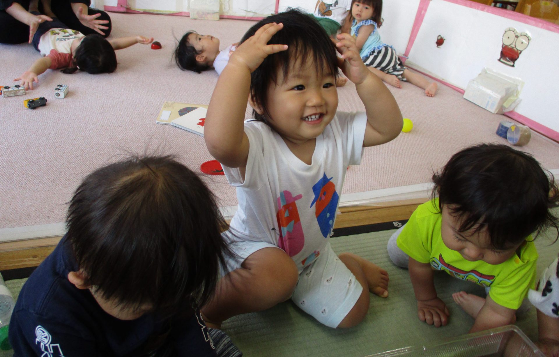 かたつむりの歌を歌い「♪つのだせやりだせあたまだせ~」に合わせて頭を触ってノリノリ。
