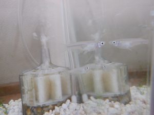 生まれてから2ヶ月たち、赤ちゃんもようやくメダカの形になってきました。 「大きくなってね」