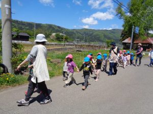 さわやかな春風の中、1歳児さんから4歳児さんまで一緒にお散歩に出かけました。