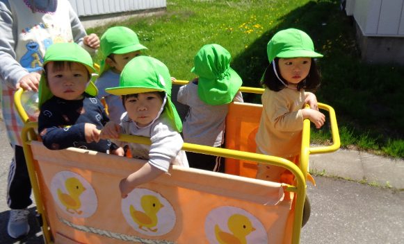 1歳児さんは、先生の押すお散歩カーに乗ってご機嫌。