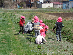 年上の子が、年下の子の手を優しく引いています。「タンポポだー」「ほしい」「(歩くの)止まったら採れるよ」