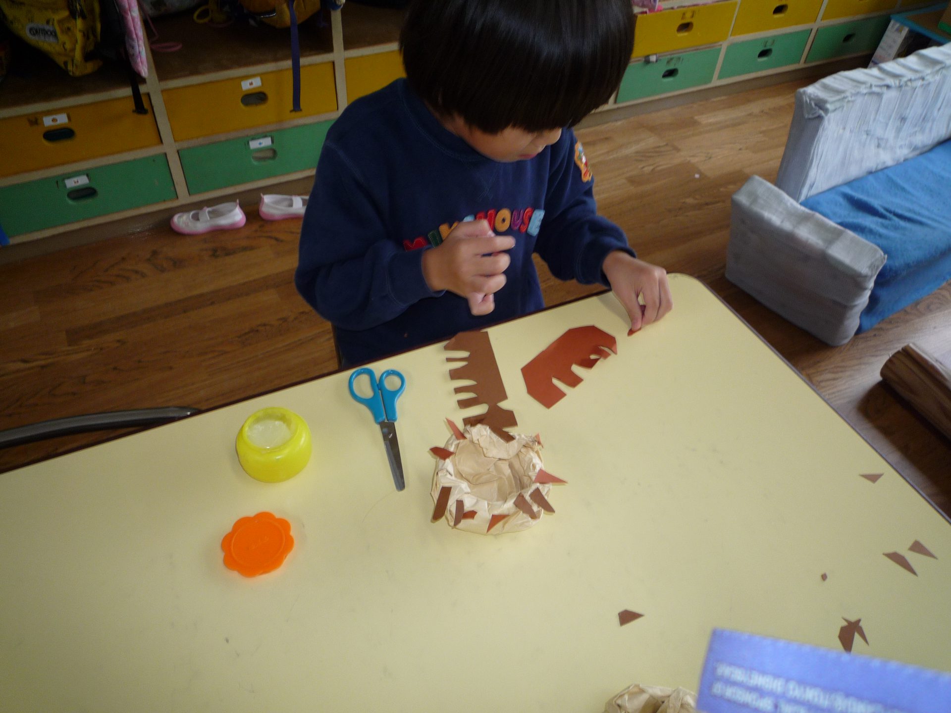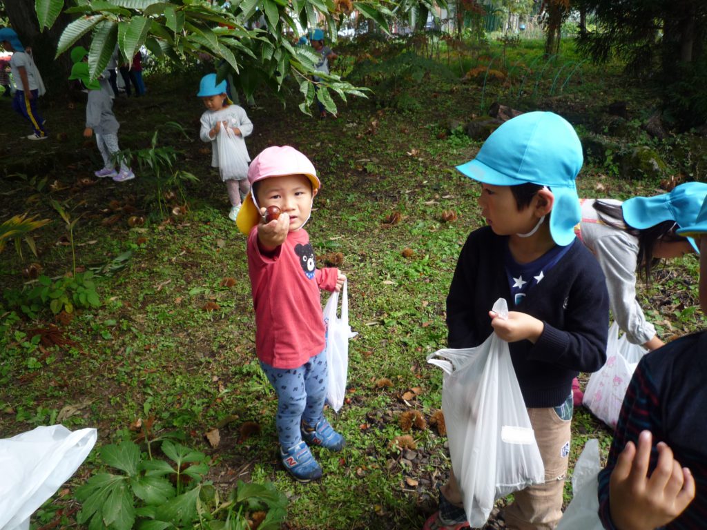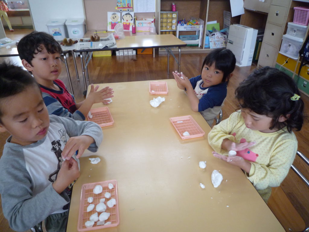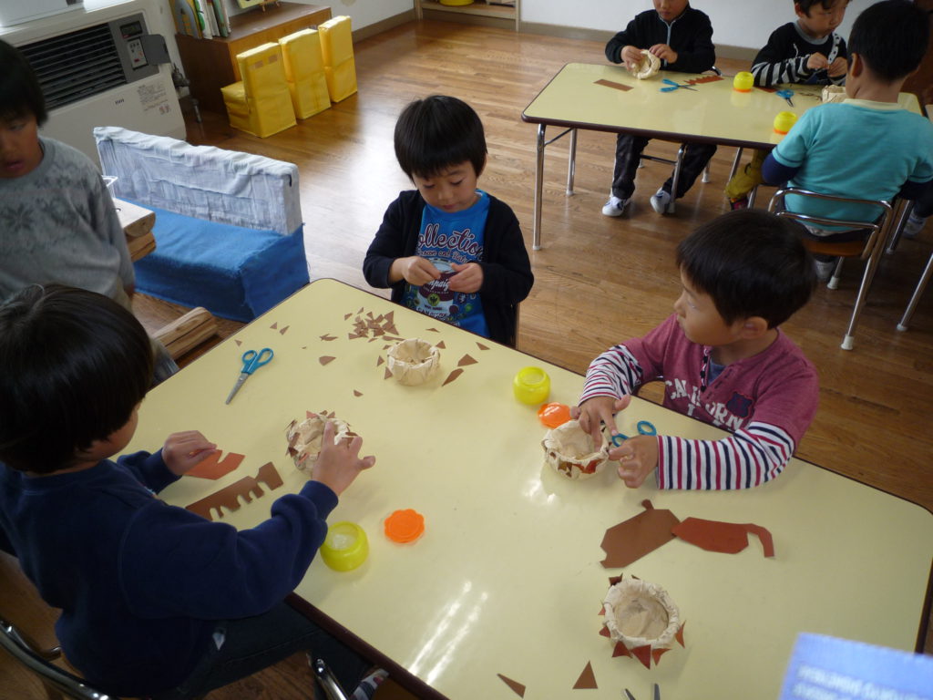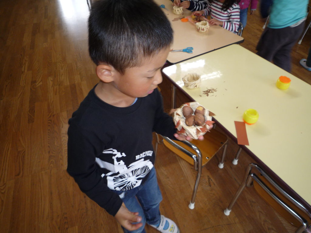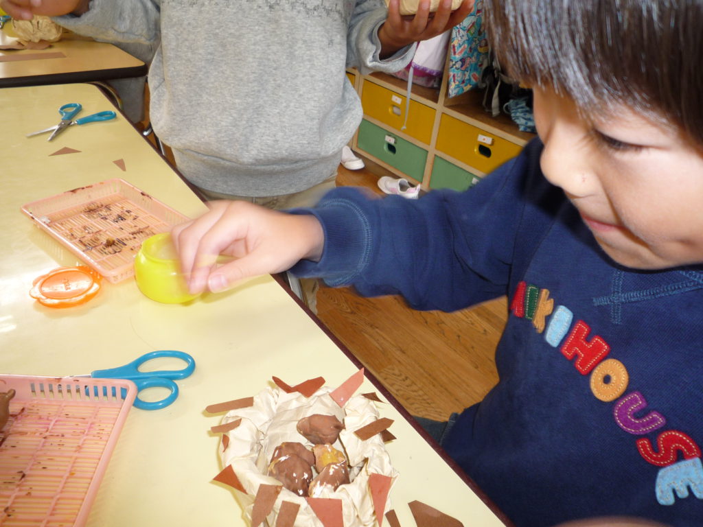 イガも作りました。細かい作業が苦手な子も「イガ尖ってた」と細かく切りながら夢中で作る姿がありました。