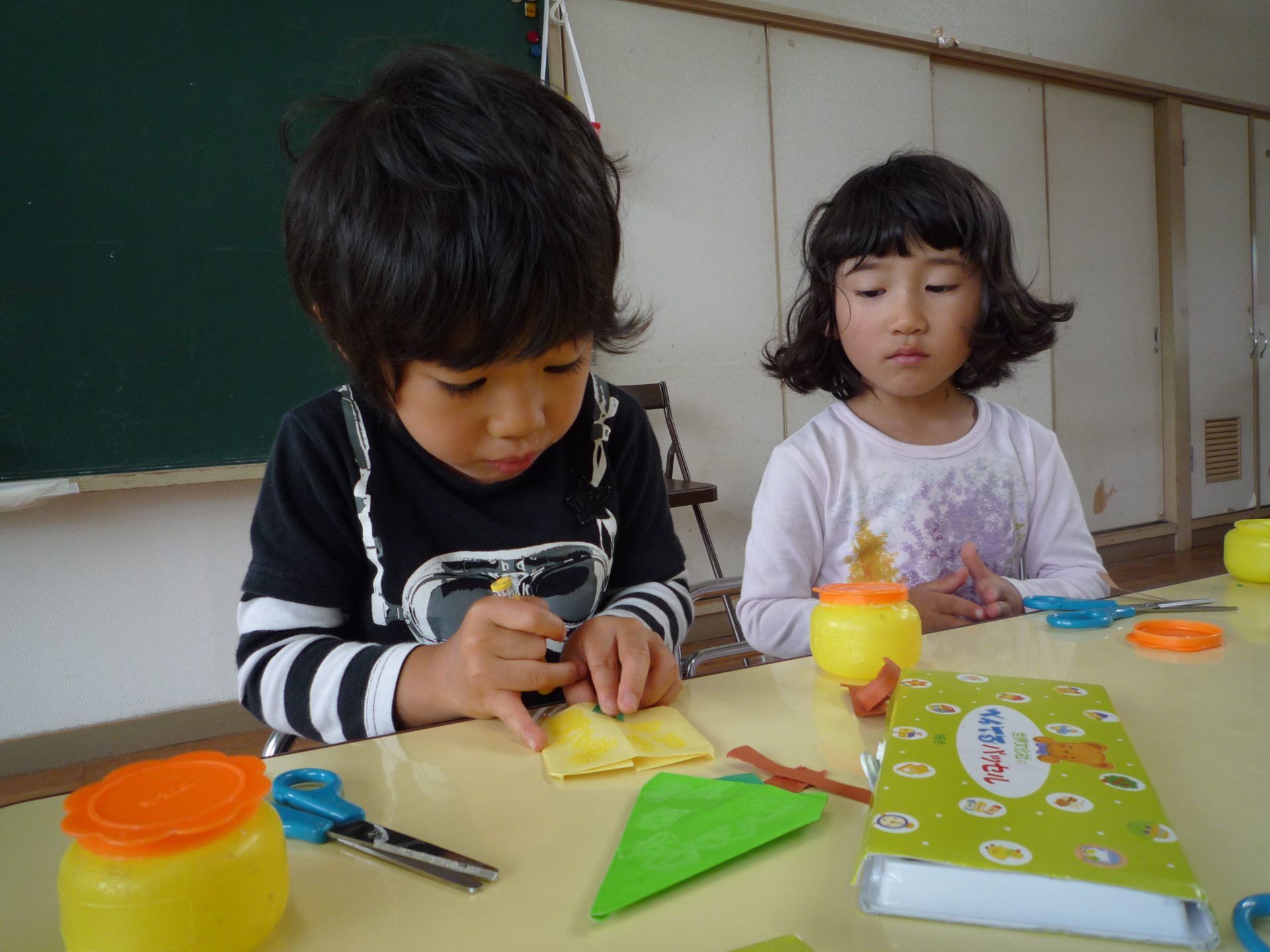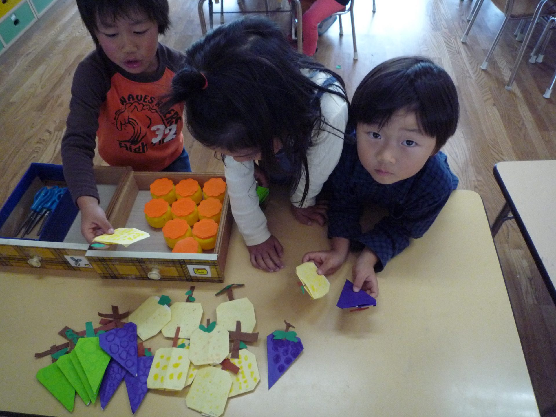 信濃町は果物が育つ気候ではないので散歩で見る機会はないのですが、栄養士の先生が見せてくれる果物を毎日見ているので葉っぱや枝を細かく作る姿がみられました。