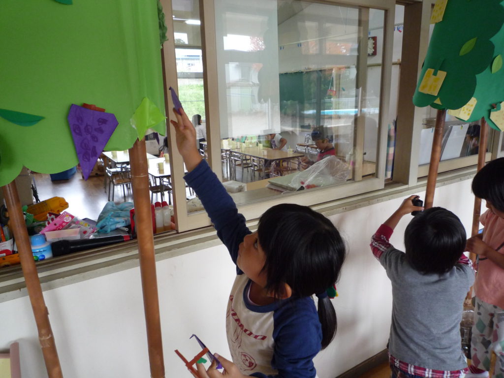 完成すると木にぺたぺた・・・。貼り付けることを楽しんでいました。