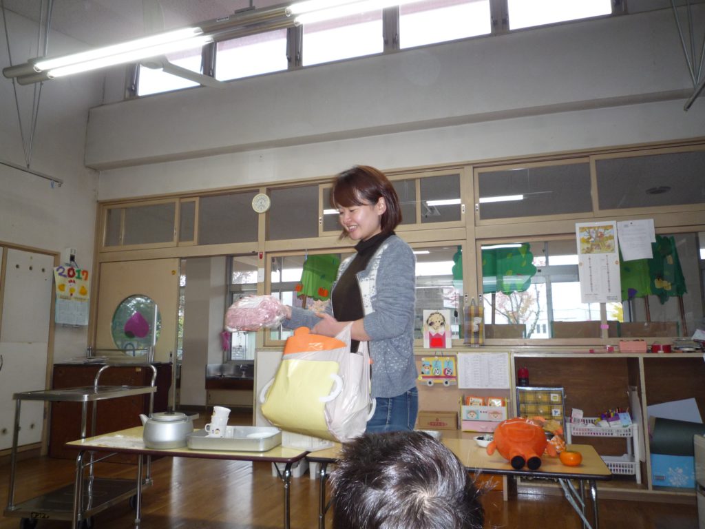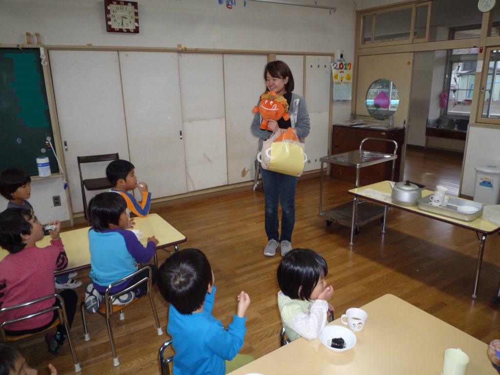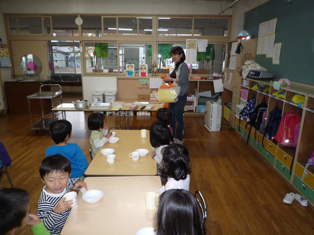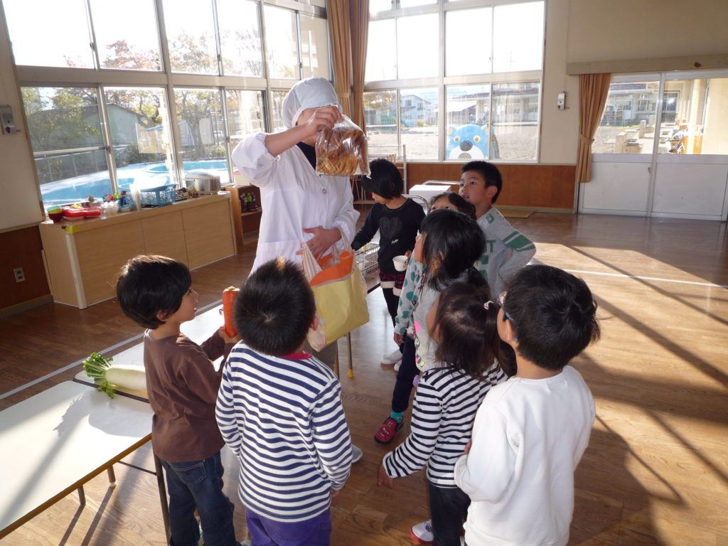 さて、信濃町の保育園では栄養士の先生がおやつの時間に次の日の食材を紹介してくれます。