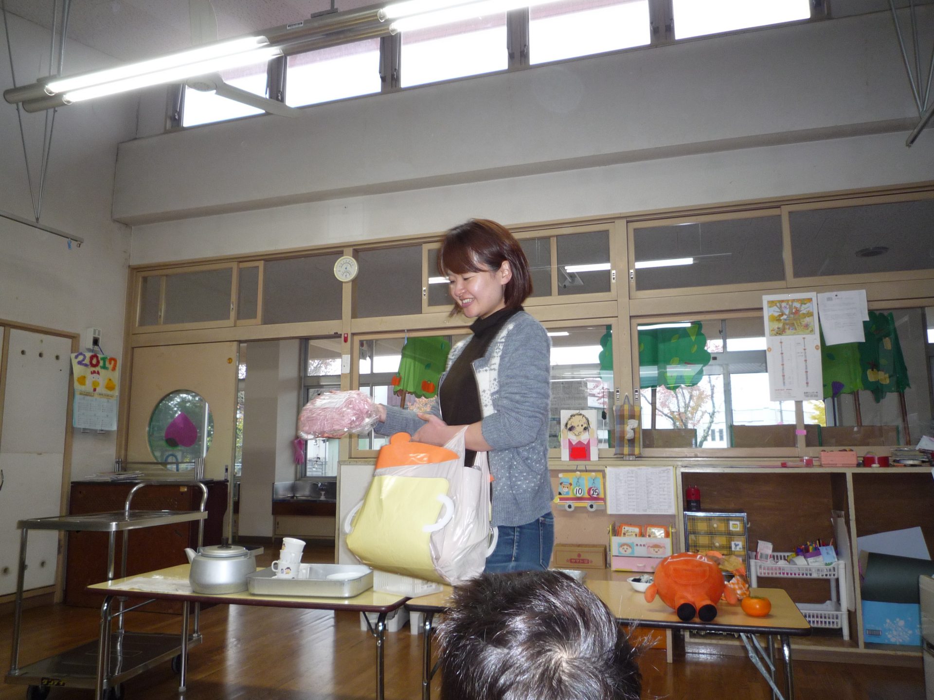 おやつの時間に栄養士の先生が来るのを心待ちにしている子ども達。さらに旬ちゃんがいるとさらに盛り上がっています。