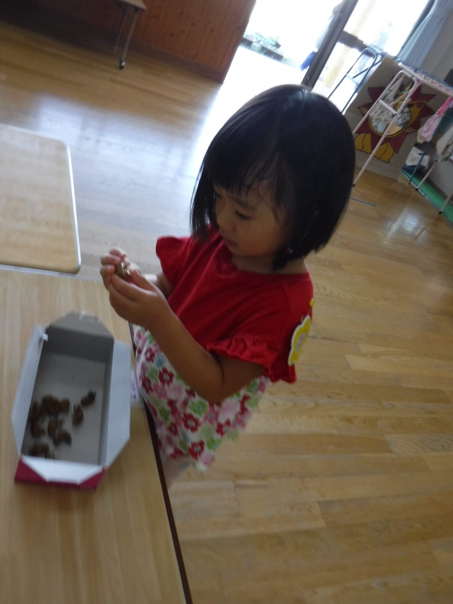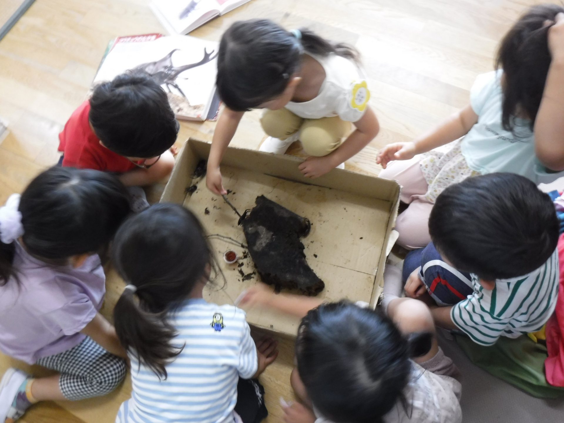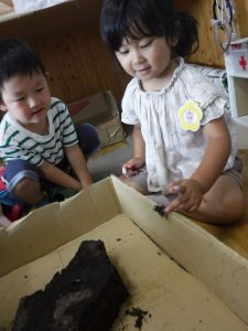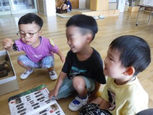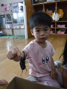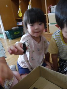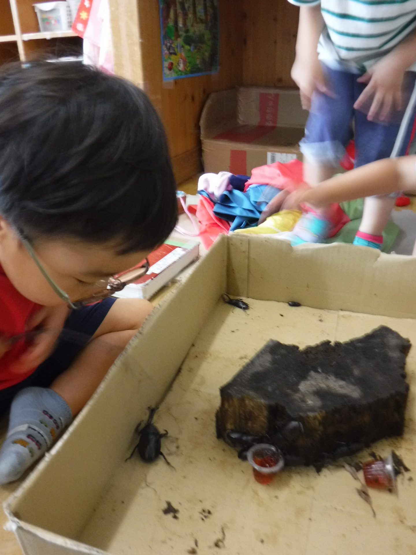 保育士が準備したクワガタとカブト虫を身近で見てふれ合えるようにダンボールへ出しました。