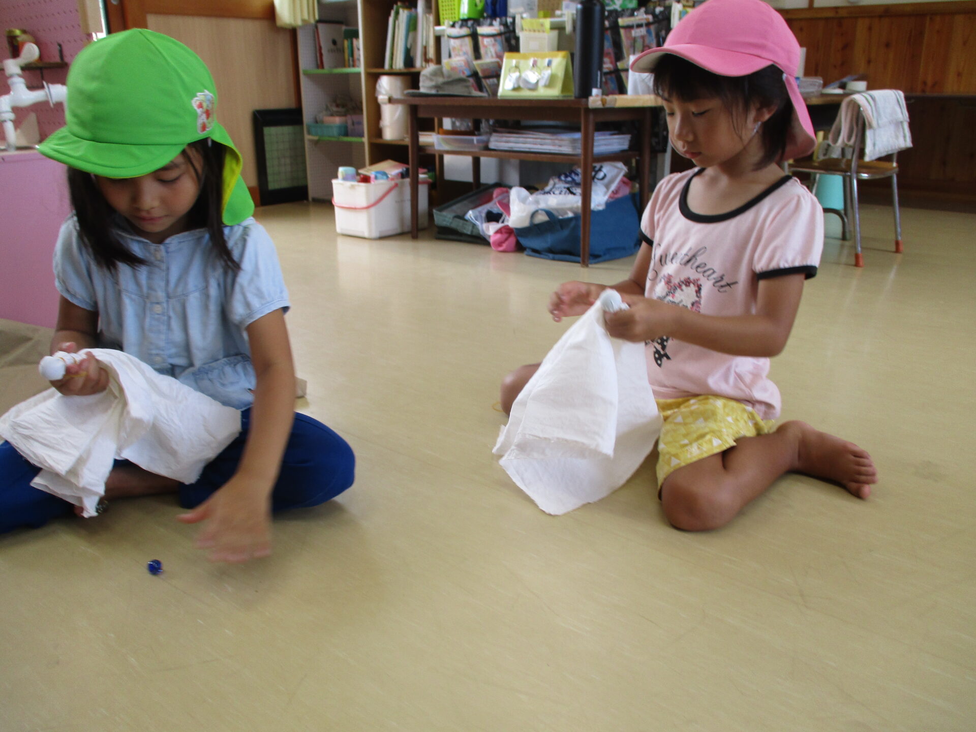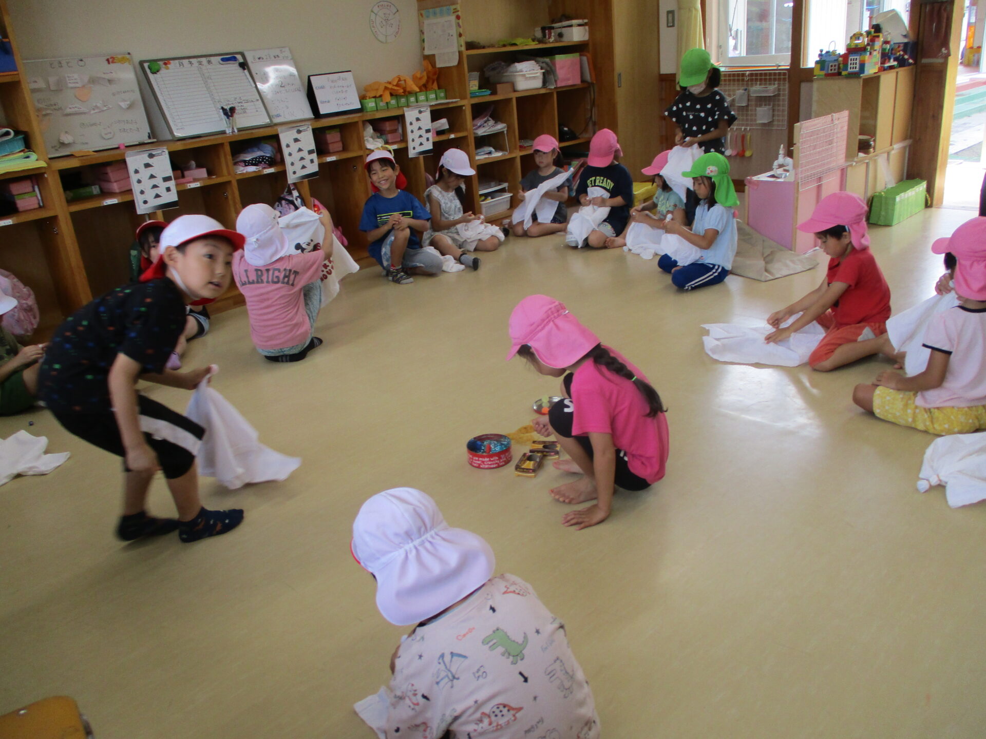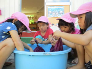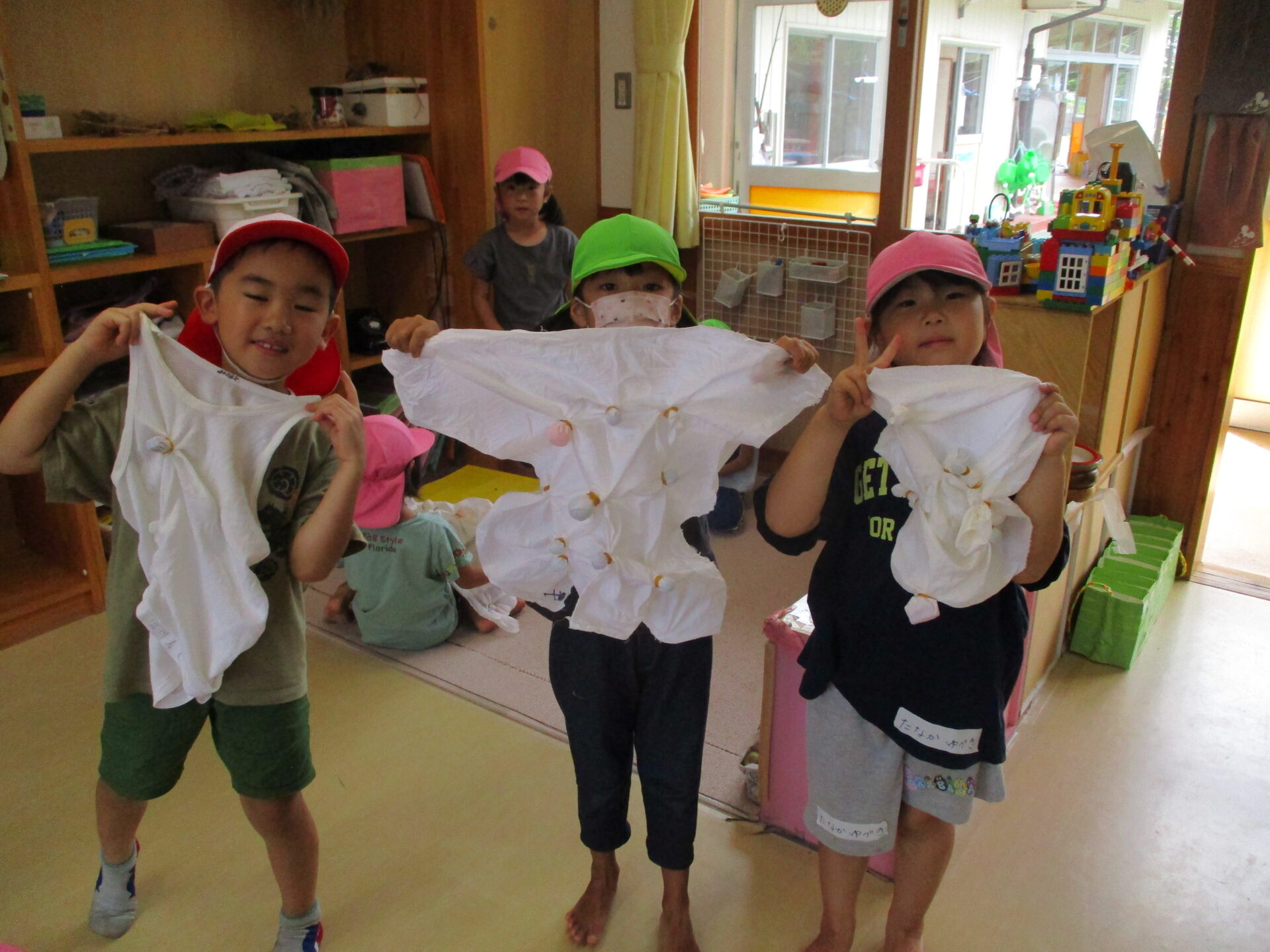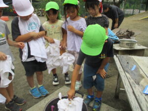 布を入れたり、Tシャツをいれたり・・・・「お~~きれい」「どんな色になるのかな!?」