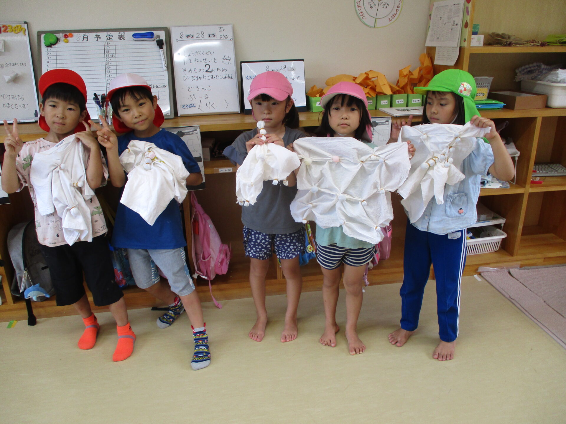 こんな感じ!絞ったものをとってから・・・「なかなか取れないよ😢」「きついな~」できないところは、友達や先生に「たすけて~~」と、少し手伝ってもらって・・