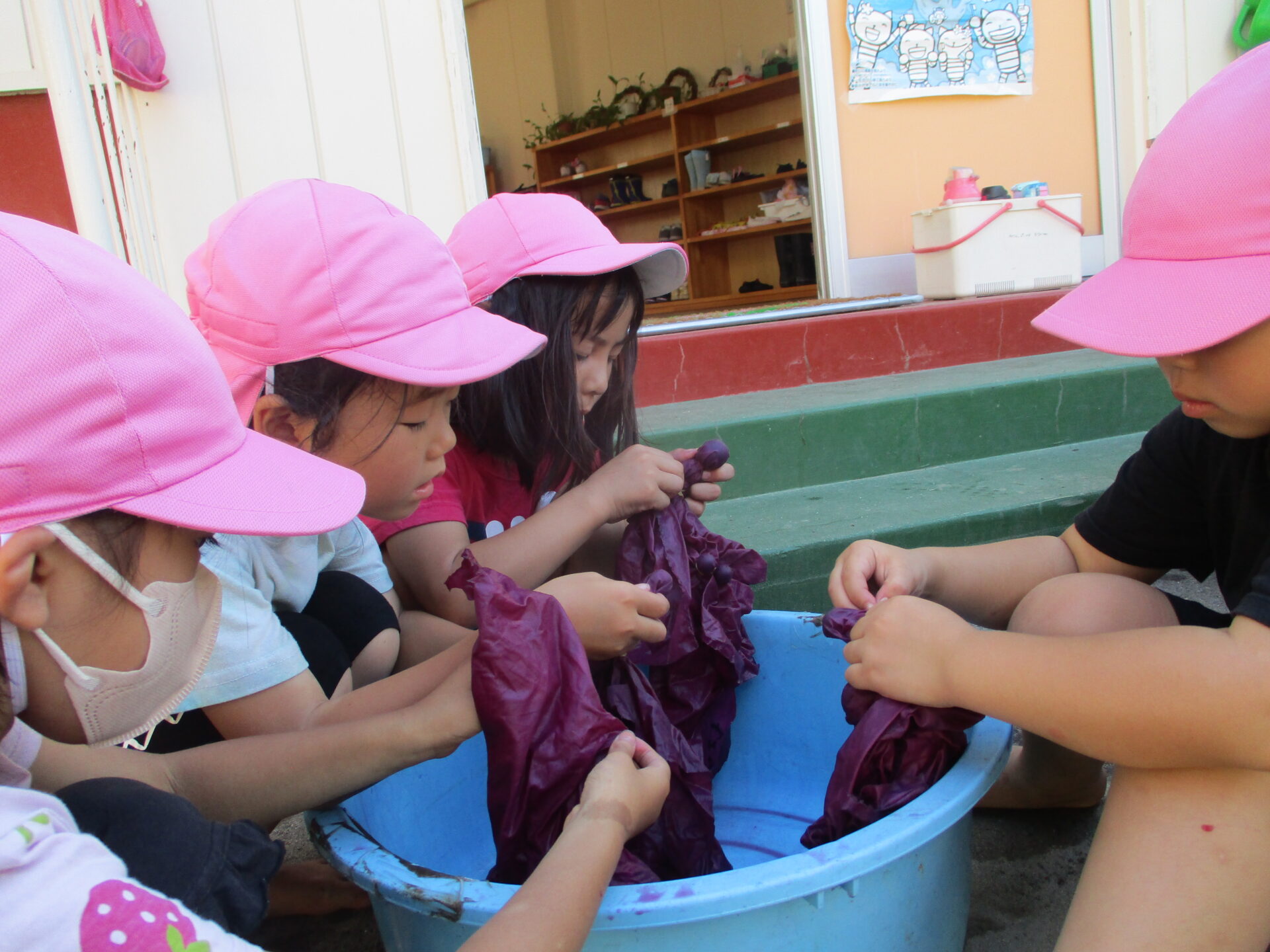 ・染め物をしたいと考えていたが、子供達が「桑の実いいな~」から、小学生に「畑に桑の実あるよ」と、教えてもらったことで摘むことができた。小学生も染め物をしたいとのことだったので、交流をしながら、染め物体験をしてもらうこととした。