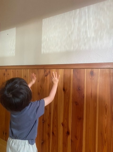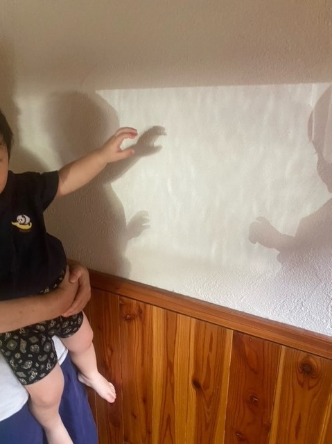 ・1歳児でも、自然現象に不思議さを感じ、感動する姿を見ることができました。影が写ったり、光で手の色が変わったり、不思議さに触れることで楽しさを見つけることが出来てよかったね。まだまだ知らないことがたーくさんあるから、楽しいことをたくさん経験して大きくなってね。