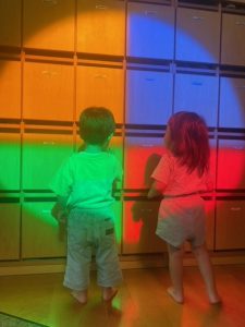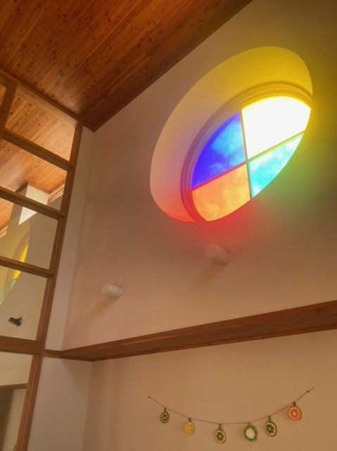 下駄箱に写る赤、青、黄、緑の4色の光が子どもたちは大好き。