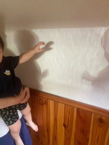 影が写ることも発見した子どもたちは、必死に手を伸ばしたり抱っこをしてもらったりしながら、影絵を楽しみました。