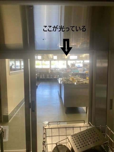 さらに給食室の奥には、職員の車が停めてあり、太陽の光がフロントガラスで反射していました。ガラスに反射した光と、唐揚げから出るおいしそうな陽炎と湯気が、離れた壁に写り不思議なキラキラとゆらゆらを創り出していました。