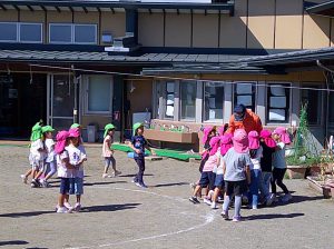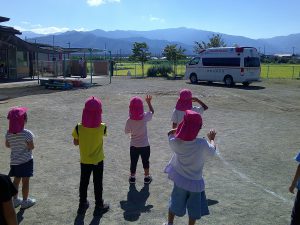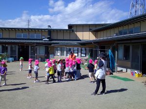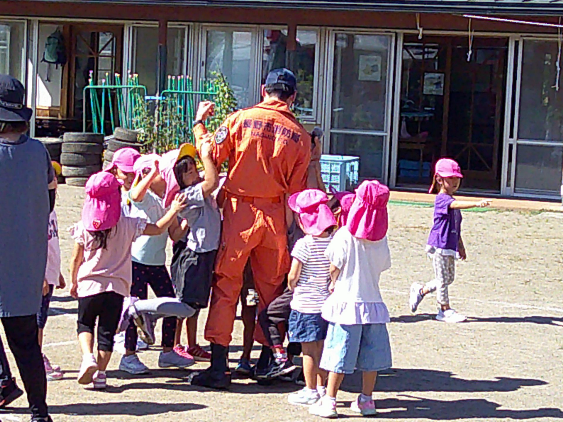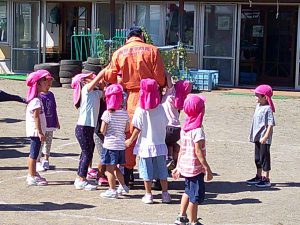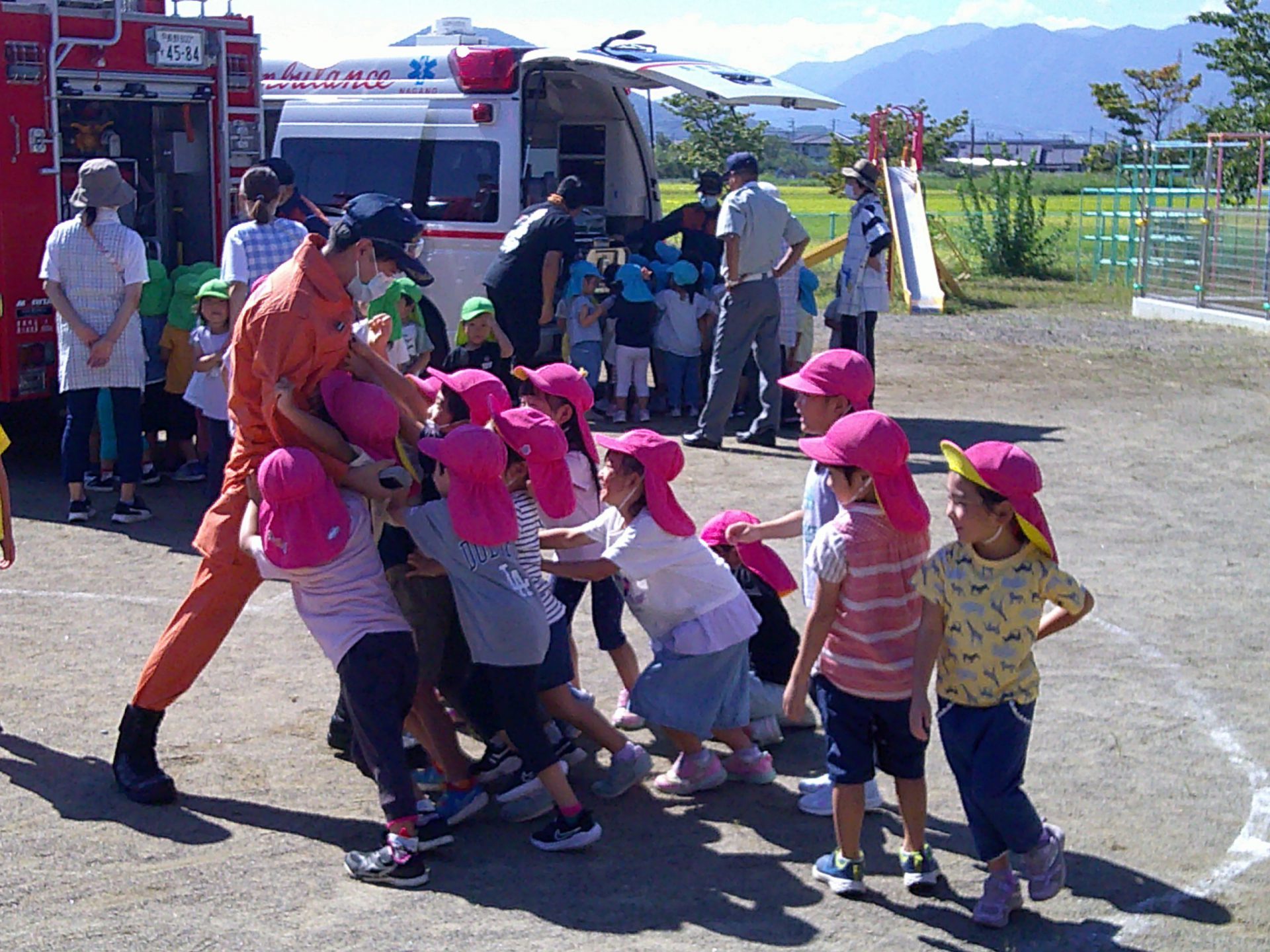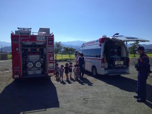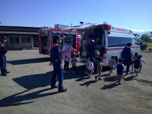 日頃、避難訓練等で火災や地震のついての話に触れることはあっても、救急という観点では話す機会がなかったため、今回のイベントの依頼はありがたいと感じていた。朝からのティッシュ配りで、子どもだけではなく保護者への言葉がけもしてもらい、親子で共通の話題となり「あなたは赤ちゃんの時に救急車に乗ったことがあるのよ」そんな言葉も聞かれた。紙芝居を読んでくださり、消防車に加え、普段なかなか目にできない救急車の見学もさせていただけるとのことで、子どもたちが楽しんでくれればと思っていた。紙芝居や車両の見学に加え、消防署の方が積極的に子どもと関わってくださり、予想以上の子どもたちの興奮、楽しみにつながった。