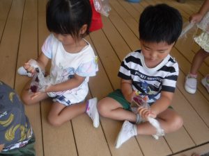 また、色、感触、匂い等、五感を使って「赤しそ」を知ったり、色水をつくって色あいを楽しんだり様々な発見もすることができました。