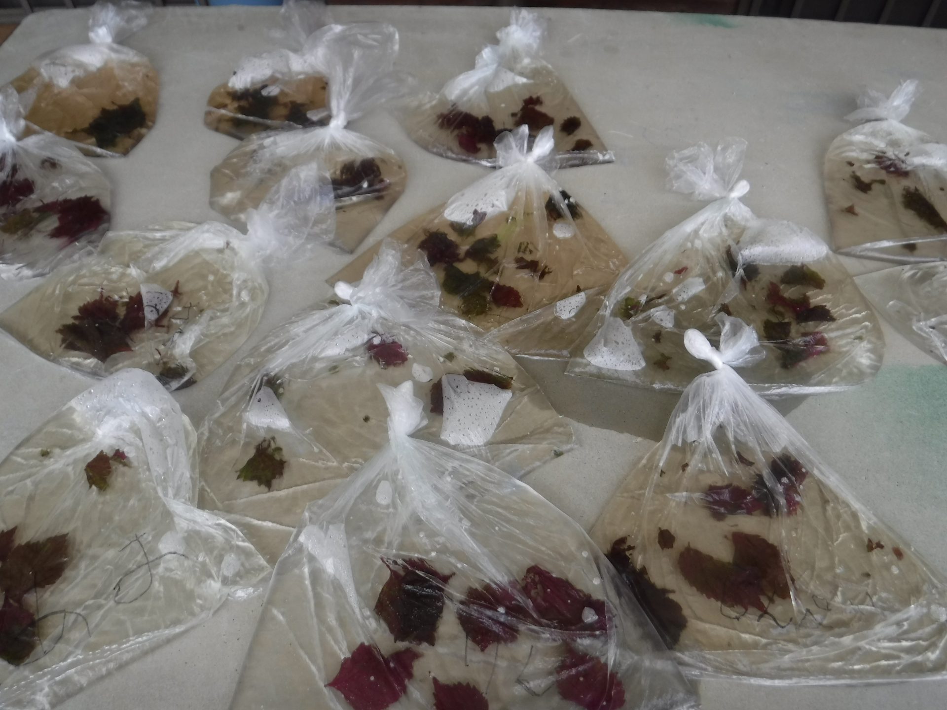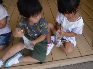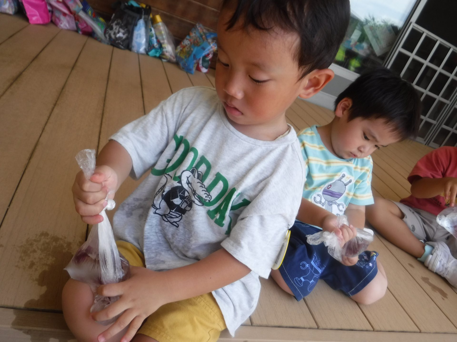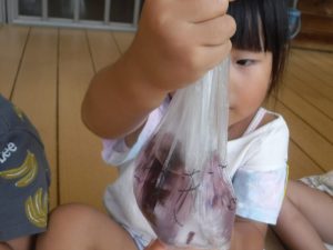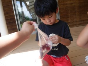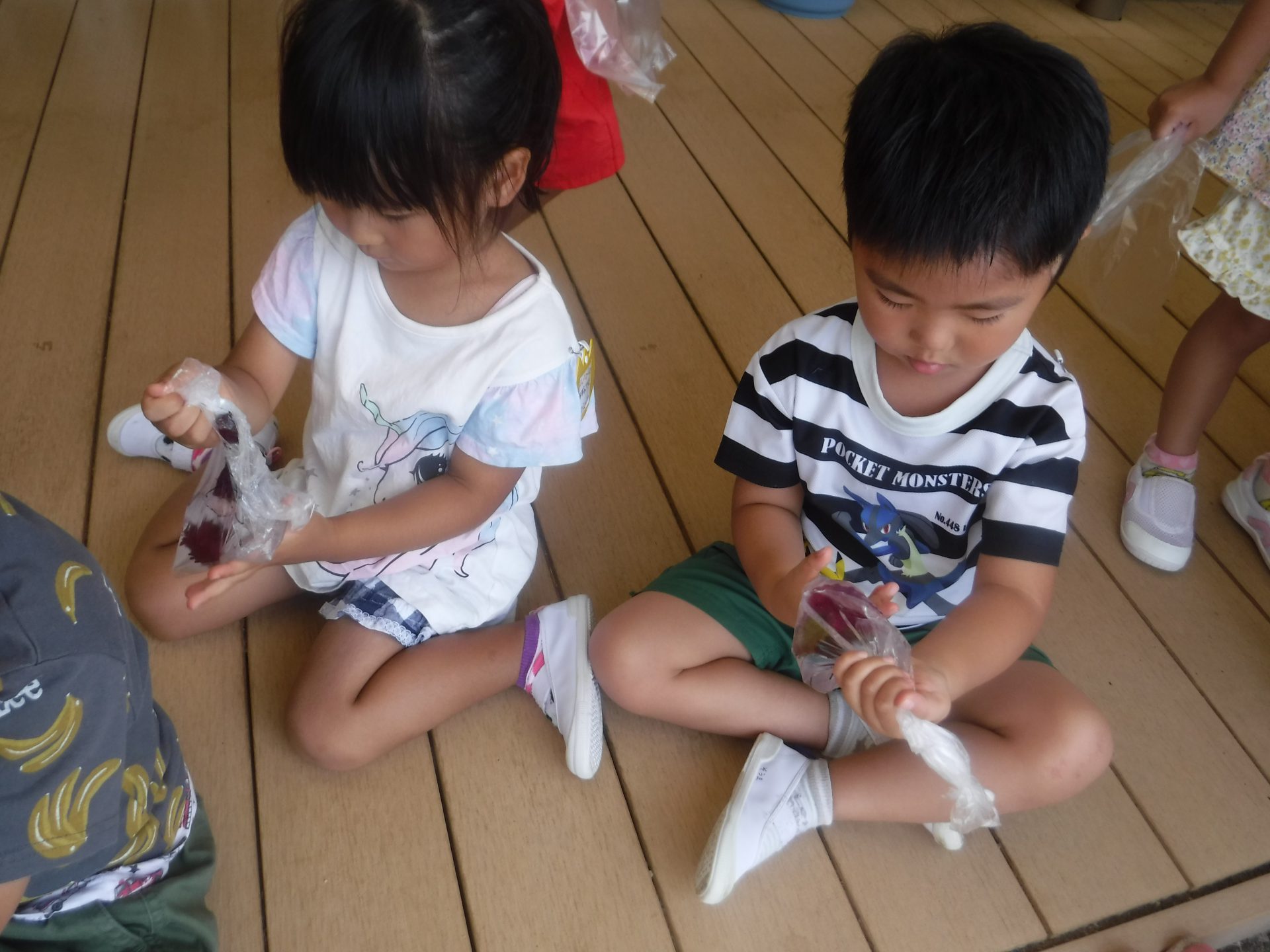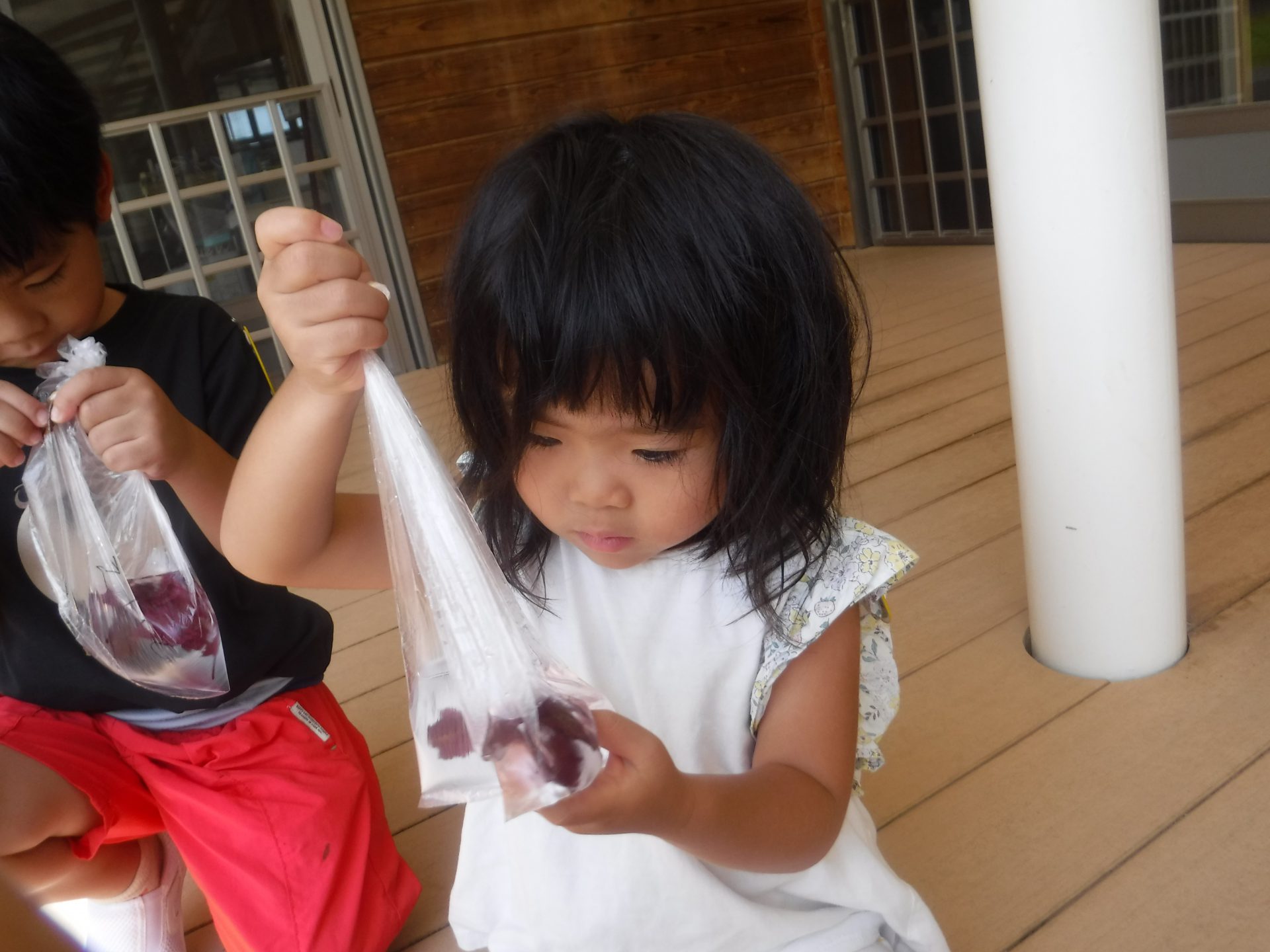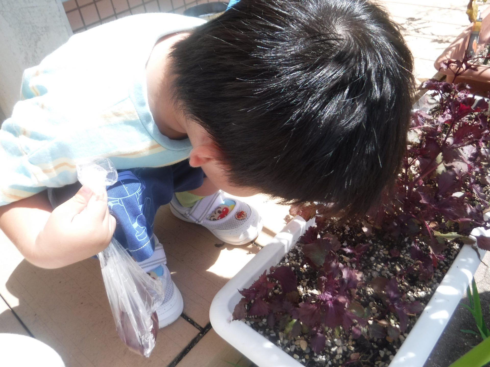 草花で色水遊びを楽しんでいたこともあり、赤しそを使って色水遊びも楽しみました。 自分たちで育てたしその葉を収穫!ビニール袋に入れて一生懸命もみもみしていると・・・