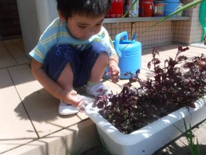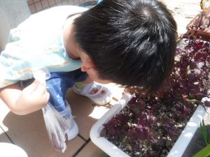 日に日に育っていく赤しそを眺めながら、「はっぱがざらざらしてるね!」「なんかいいにおいする!」と友だちと会話が弾みます。