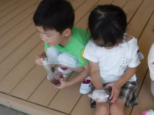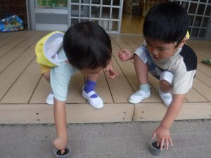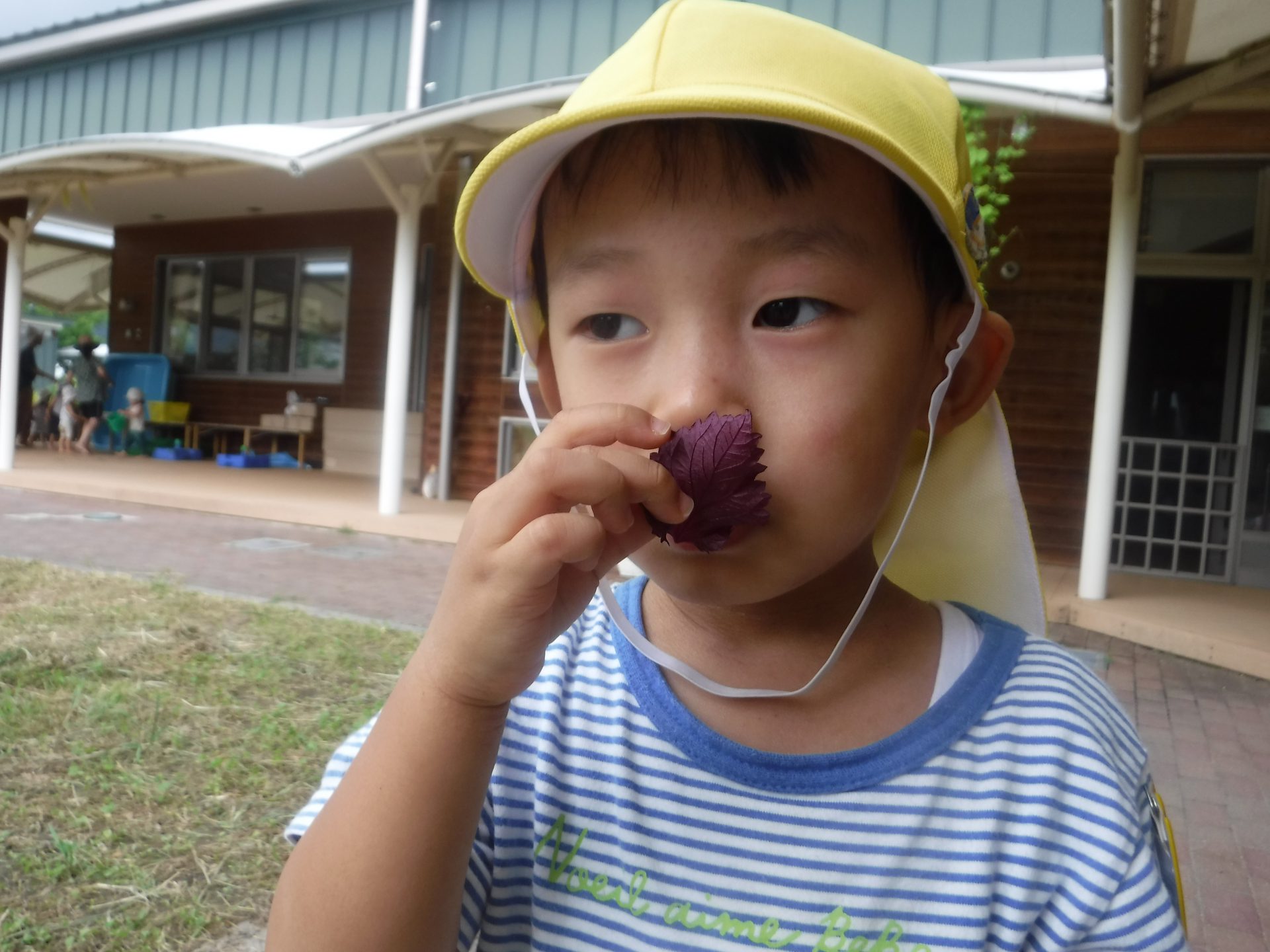 「しそジュース」を作る前に何色になるかな?とみんなで話しました。 「葉っぱだから緑色?」「赤色!」「お水とまぜたら黄色になるかな?」等、草花あそびでの経験で想像していたけれど、赤じその葉をもんでいくと 「むらさき色」や「ピンク」に変わり、たくさん葉っぱを入れた子と、少なかった子では色合いが違うことも発見! しその葉特有の感触、匂い、色を感じながら、野菜に親しんでいました。