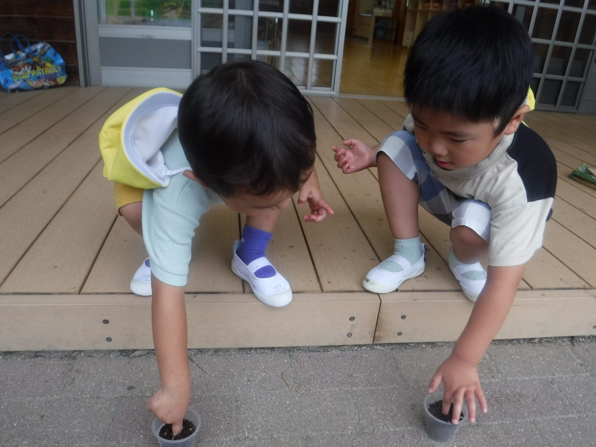 5月にトマトやスイカの苗を植え、水やりを楽しむ中で少し野菜に興味を持ち始めた子どもたち。 今度は赤しその種を植え、育ててみることにしました。 赤しその種はとっても小さな種。そーっと土の中に入れ、優しく土をかぶせました。