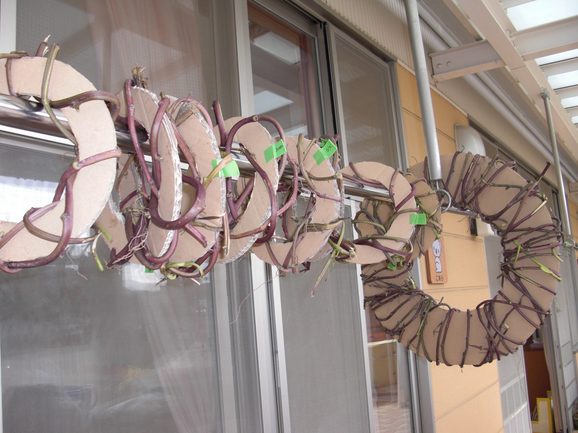 「段ボールに巻いて、リースが出来ました。」