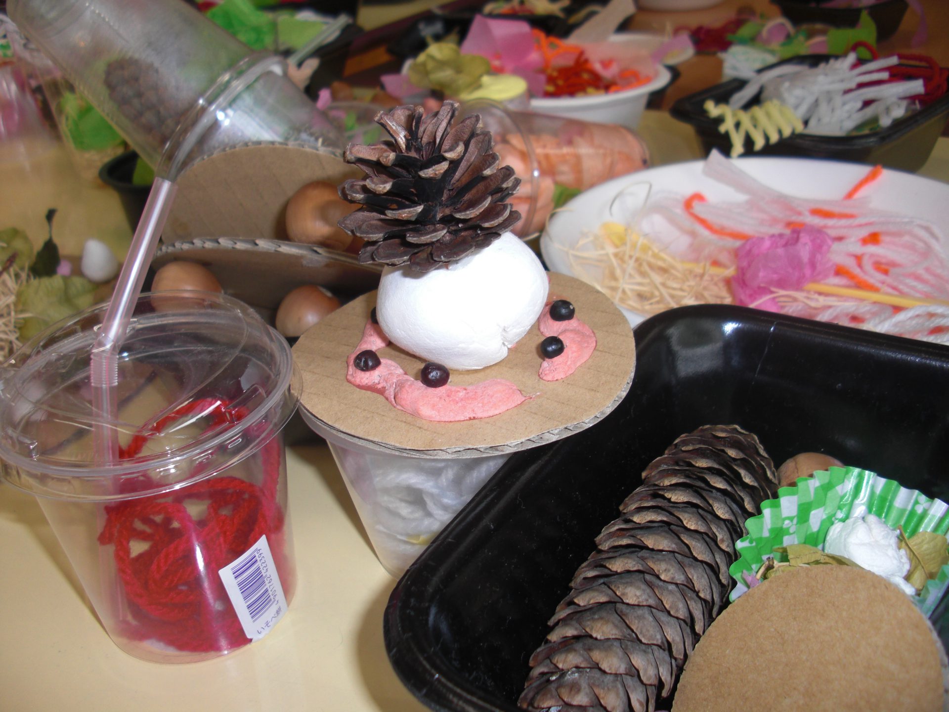 今年は天気に振り回されてなかなか思うように秋の自然に触れる機会がとれずにいます。そんな中でも雨が止むと「待ってました。」と言わんばかりに子どもたちは園庭に出て秋探しが始まります。ただ園庭では、数や種類に限りがあり、なるべく子どもの思いを大切にと、散歩にも天気と相談しながら出かけるよう心掛けています。そして出かけるたびに、ビニール袋いっぱいのおみやげを持って笑顔で帰ってくる子どもたち。さぁ、あの中身は今度はどんなことに使われるのかな?どんなあそびが出てくるのかな?子どもたちの発想の豊かさに驚かされるばかりです。子どもたちは自分からいろいろ作る子もいれば友達の真似をして作る子、自分のものとして身についていくことが多いのです。たくさんの自然物に触れながら見つけて、考えて、作って、楽しんで・・・たくさんたくさんの経験をしようね。