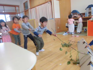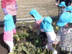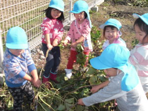 どんな小さなものでも発見する力のある子どもたち。興味を持てば、子どもの発想力は無限でさまざまなあそびが繰り広げられます。さつま芋のつるだけでもたくさんのあそびが繰り広げられ子どもたちの発想は豊かです。さぁ、秋の自然はいっぱい。やきいも会にお店屋さんごっこなどなど、これからあそびはまだまだ継続されていくのです。楽しみだね。
