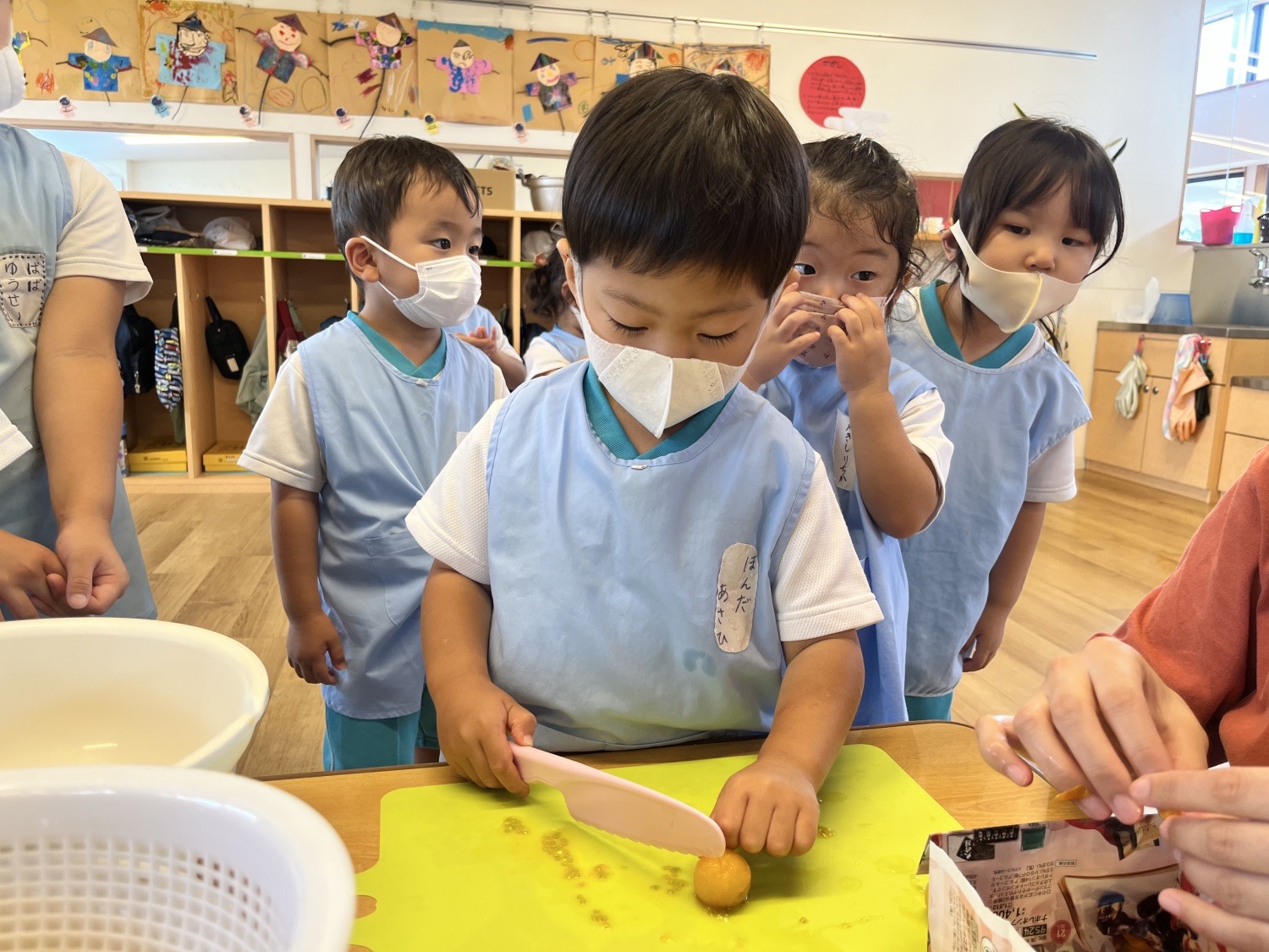 次に、包丁を使い切ってみました。年少さんは、先生と一緒に挑戦したり、年中・年長さんは1人で挑戦する子もいました。