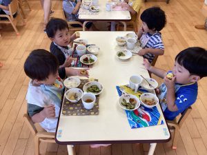 ・「保育園の野菜おいしい」と苦手な野菜にも挑戦して食べてみる子がたくさんいました。食べてみたらおいしいことに気付いたようです。