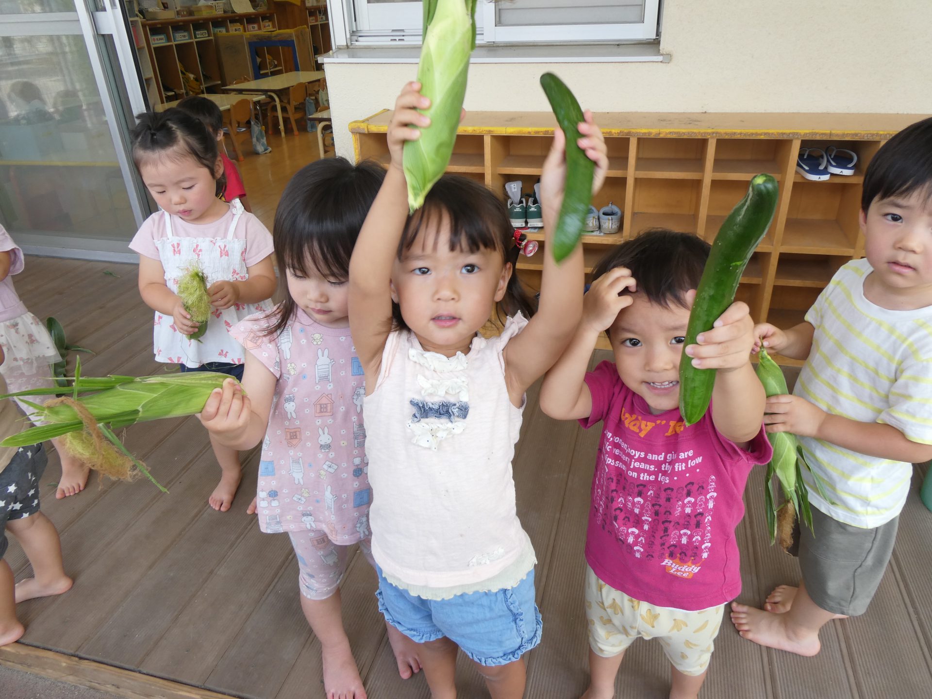 2歳児クラスは、子どもたちの好きなきゅうりとトウモロコシを育ててきました。