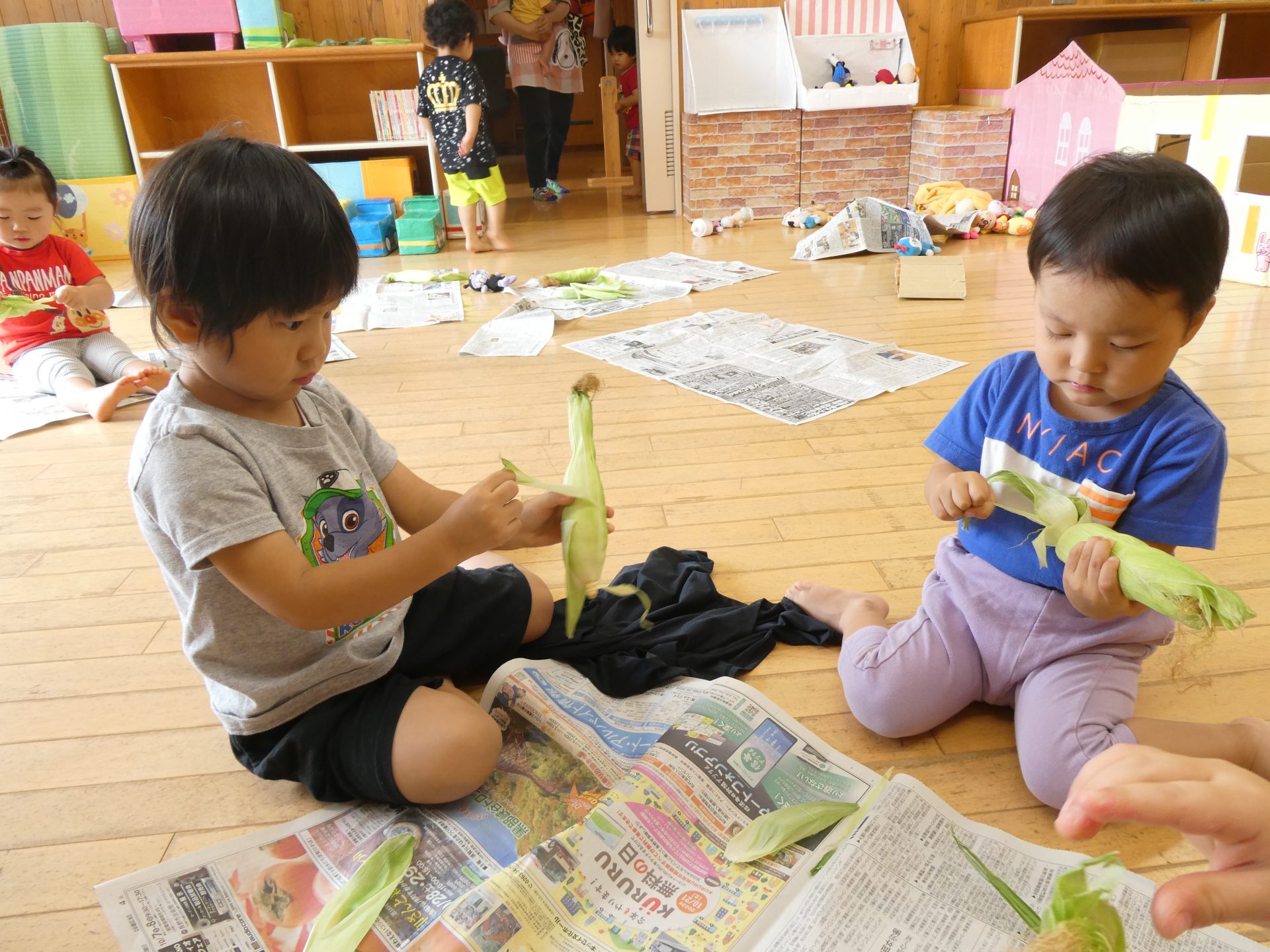 翌日に皮むき体験!真剣なまなざしで皮をむいています。トウモロコシの黄色い粒々が見えると「つぶつぶあった~!」と歓声があがりました。