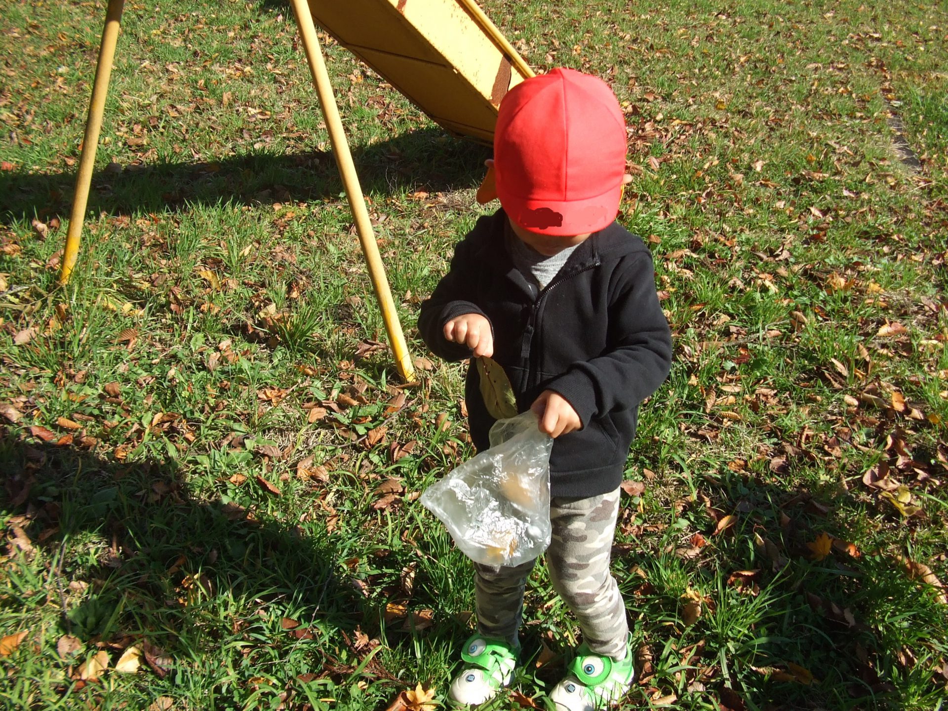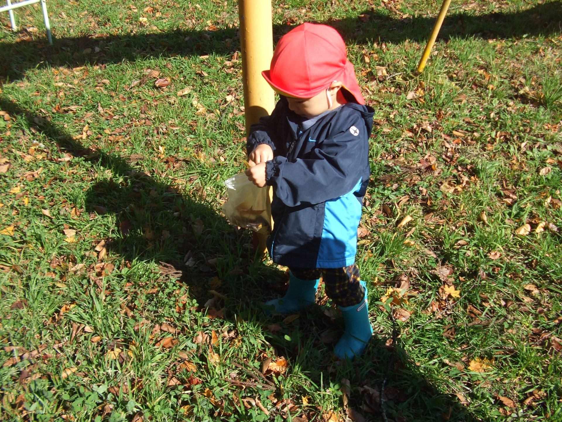 「せんせ〜!袋ちょうだい!」と男の子が落ち葉を集め始めました。