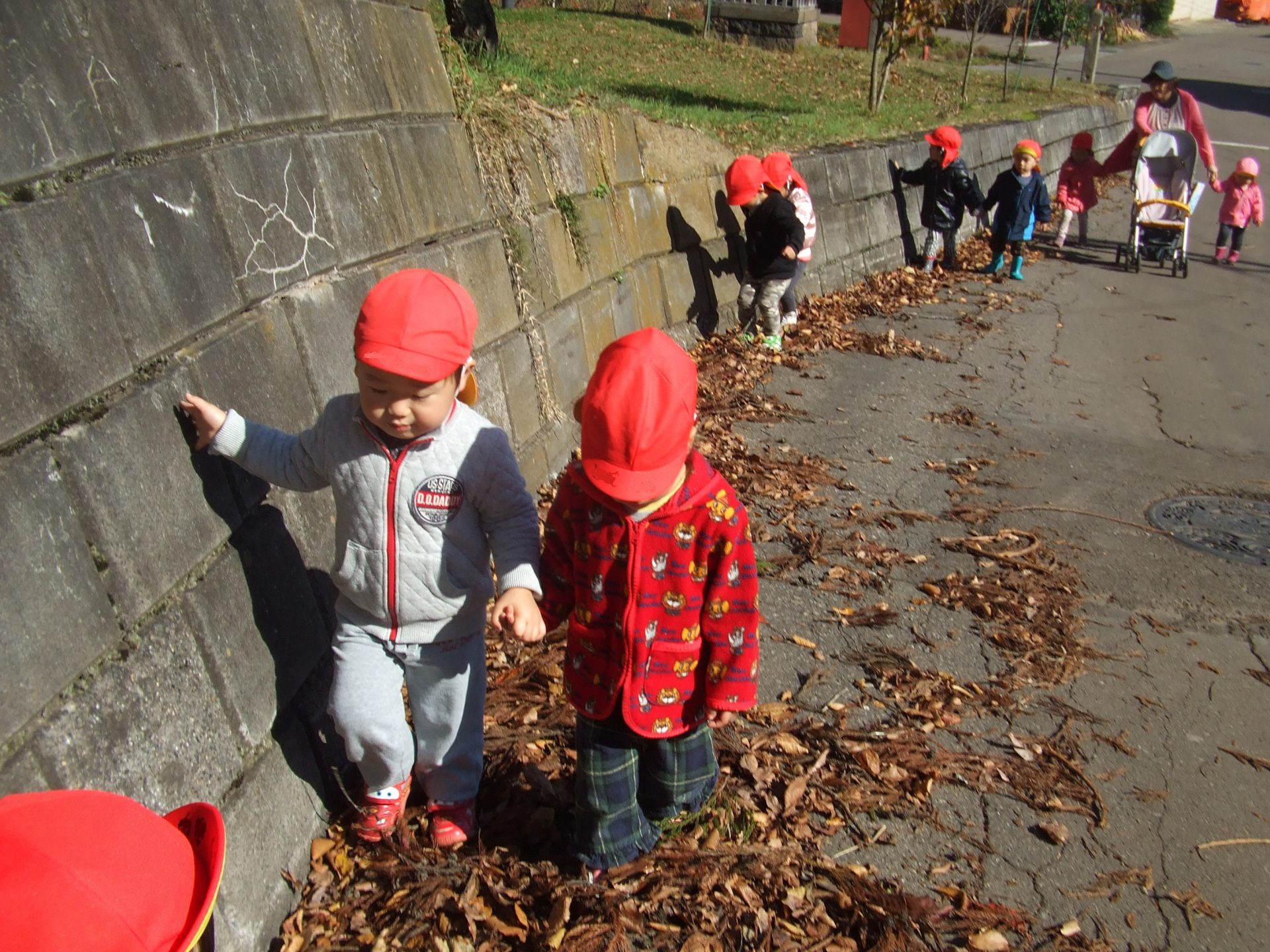 「お土産にするの?」と聞くと「違うよ。お部屋に貼るんだよ。」と言っていてびっくり!昨日、手形スタンプをして遊んだ画用紙を葉っぱの形に切って、今朝みんなで貼ったことが楽しかったようで、また貼りたいと落ち葉を集めていました。