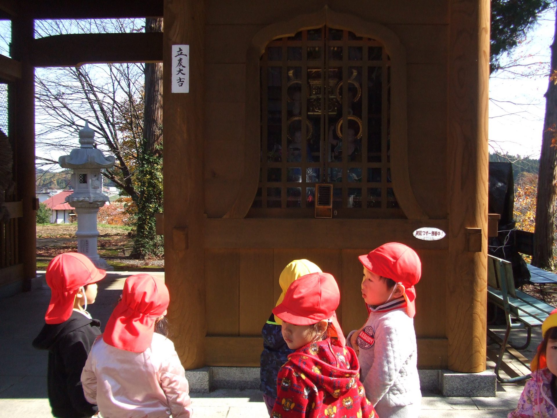 公園で遊んだ後は落ち葉をザクザクならして歩きながら、近くにあるお寺の仏様や仁王像を見てきました。