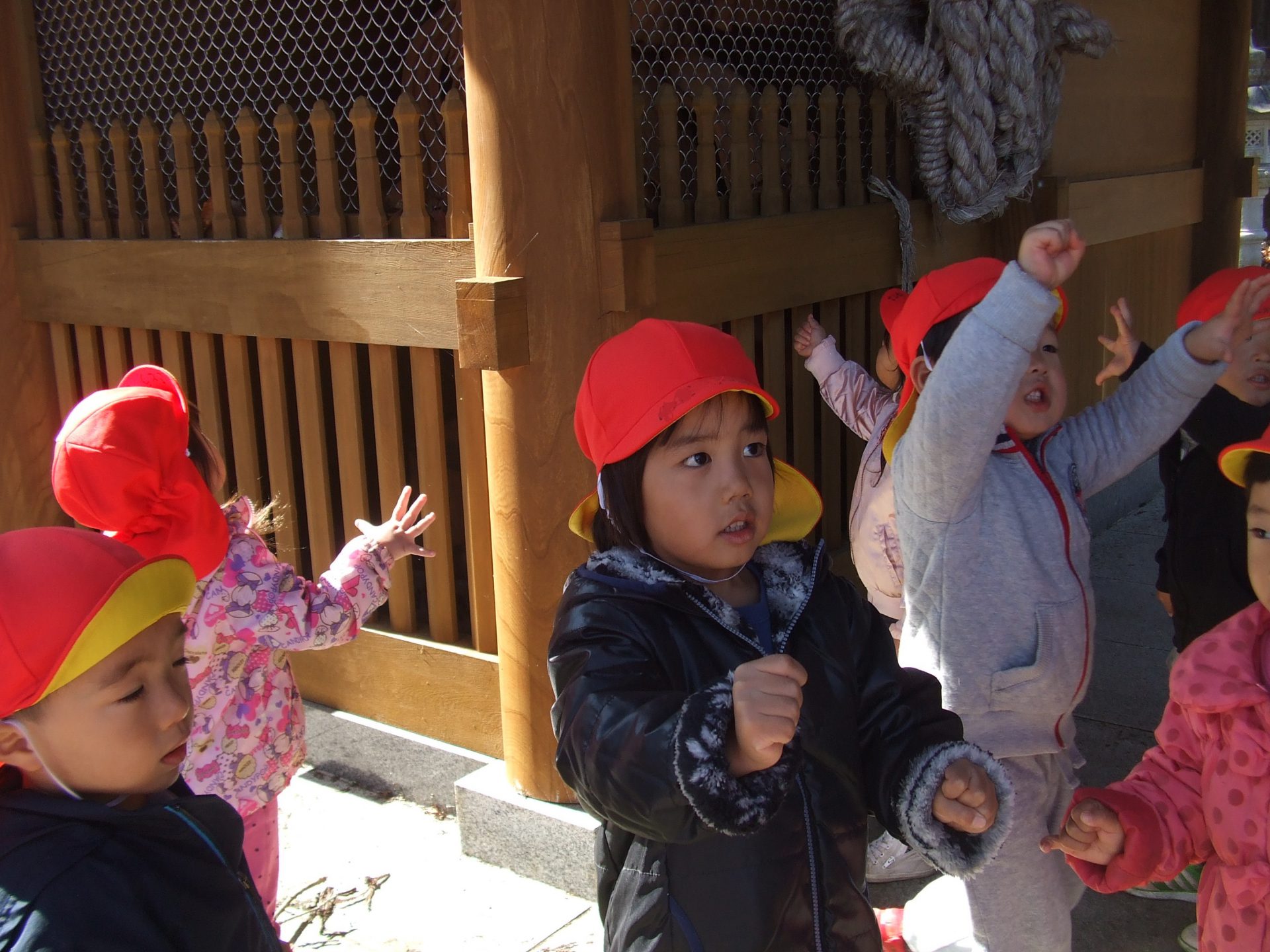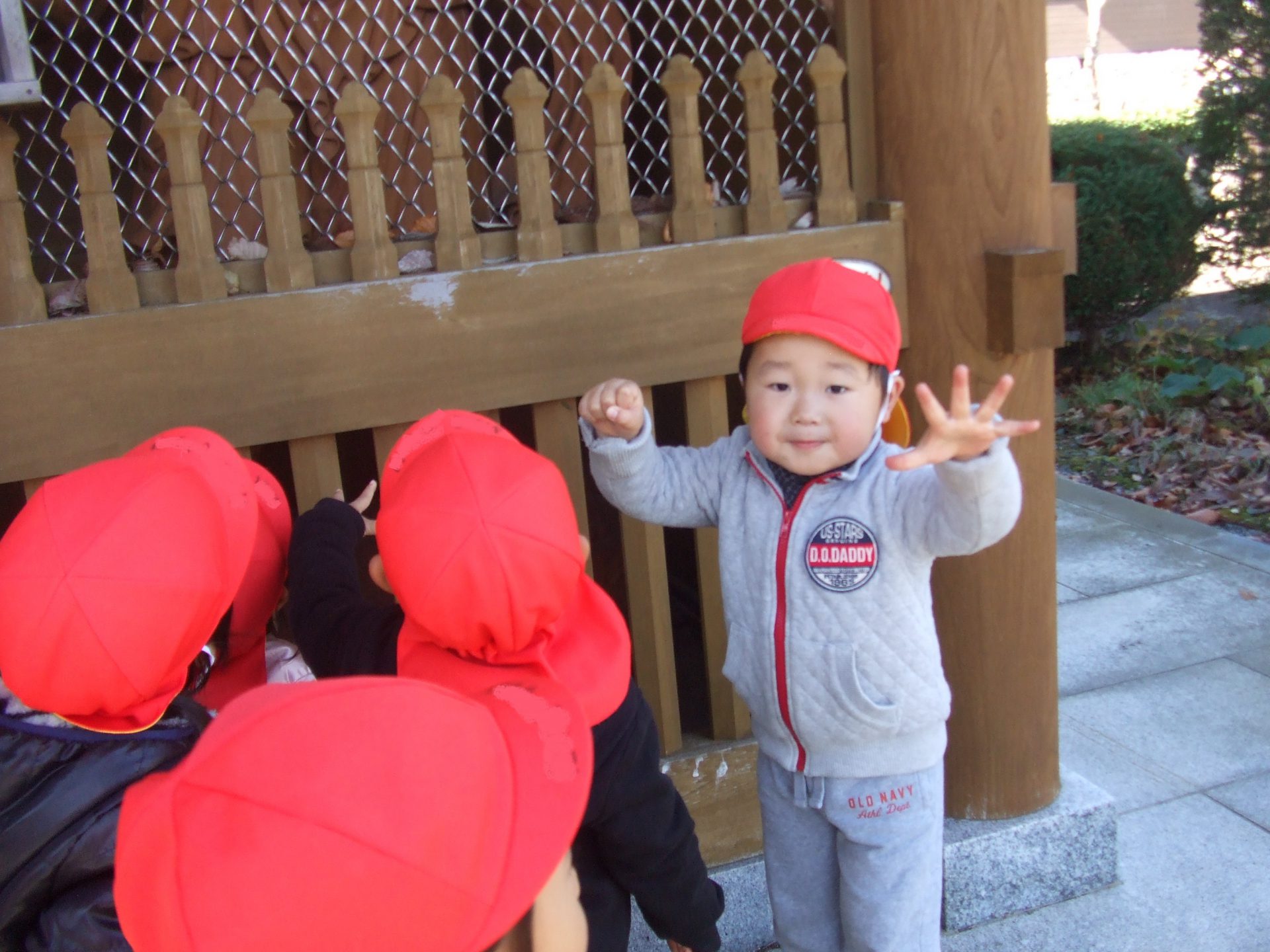 「こっちはグーとパーだ!」手先も動くようになり焼き芋じゃんけんや手遊びでグー、チョキ、パーを楽しんでいたので、仁王像の真似も上手でした。