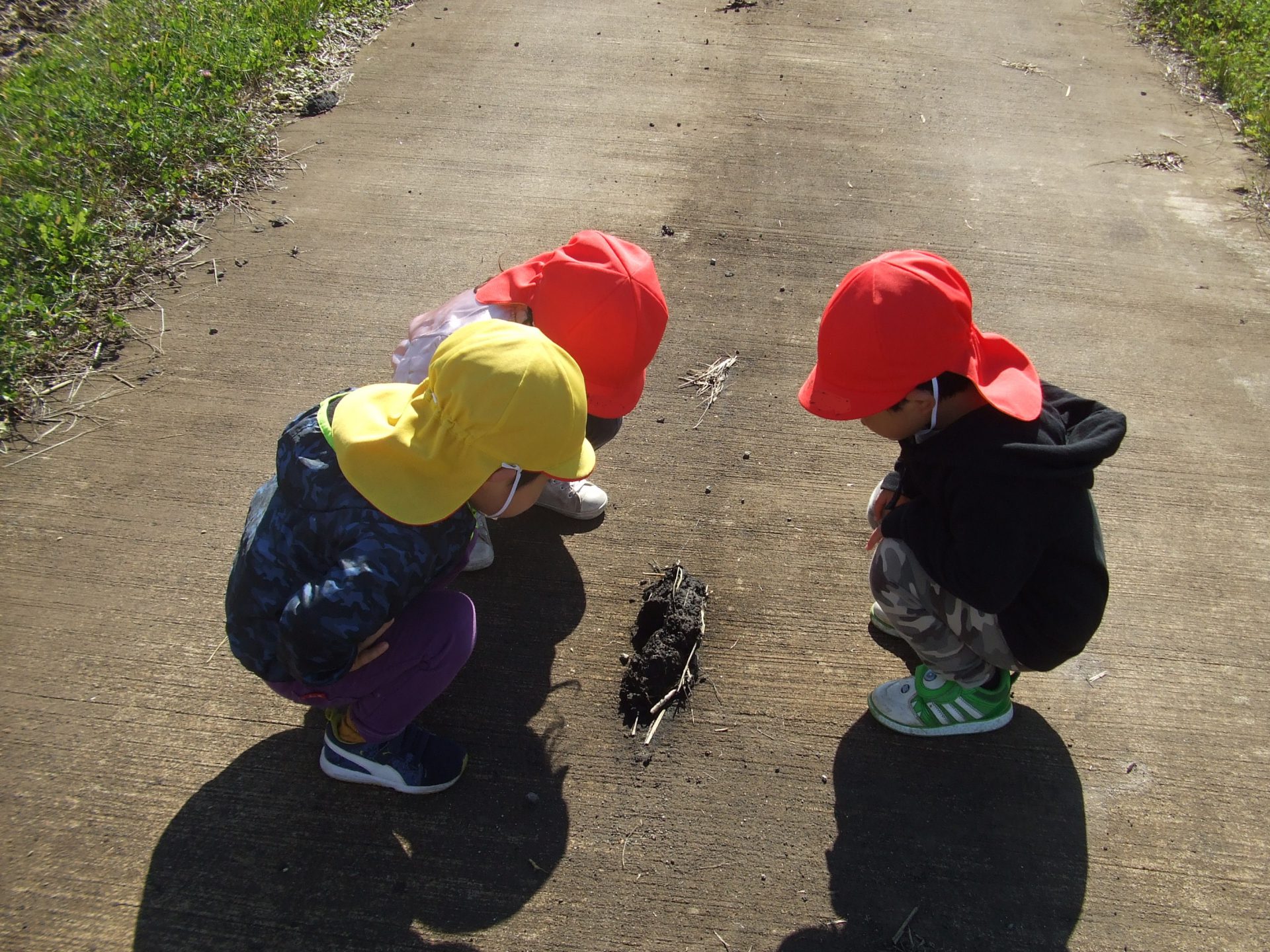 「うんちあった!」の一言でお友達が集まり、「だれのだろうね〜」会議が始まりました。実は農作業の車が落としていった『土』なのですが、「かいじゅうのうんちじゃない?」「かばだよ」「わにでしょ」「・・・おおきいね。」と大きな土が想像力を膨らませます。その後も転々と落ちている土を見つけては「これだれの〜??」と真剣に考える子ども達でした。
