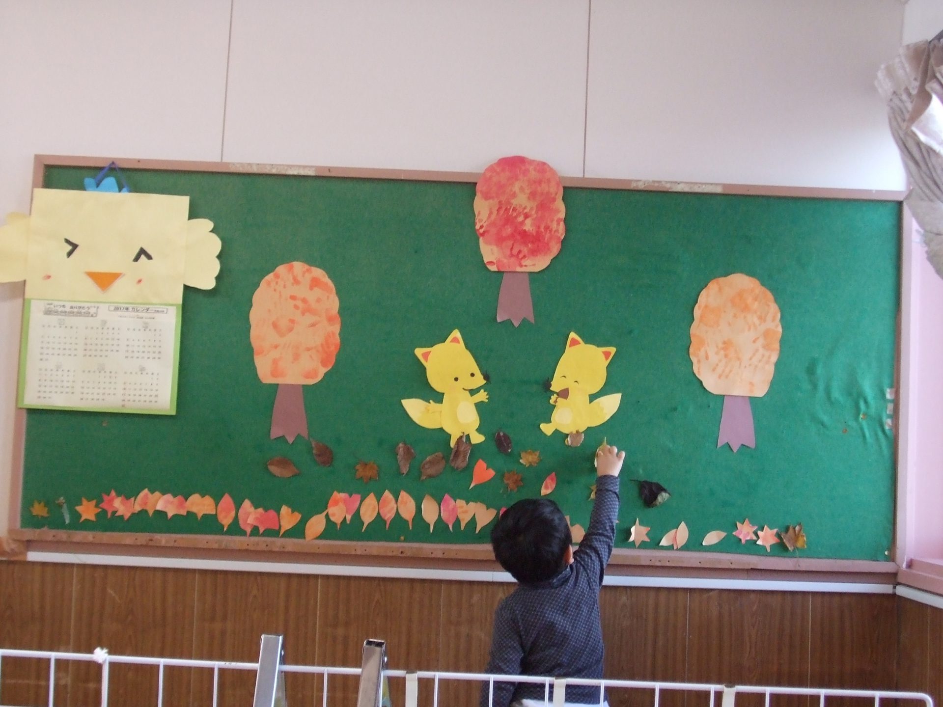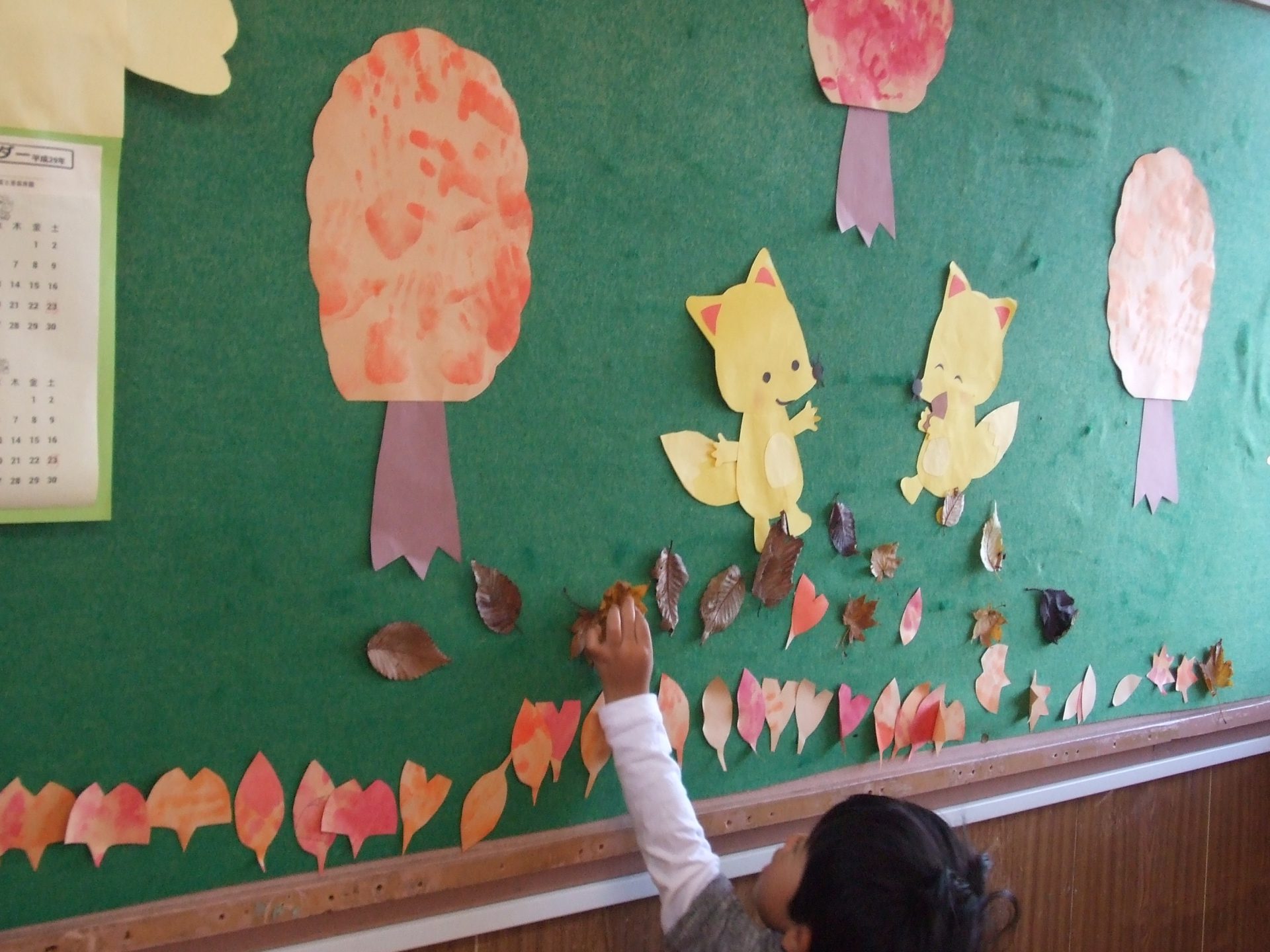 「ここかなぁ」「きつねさんの足にも貼ってあげよう。」と拾ってきた落ち葉やお花を貼って楽しみました。作った落ち葉を貼るときは並べることを楽しんでいたのですが、本物の落ち葉はばらばらと道に落ちていたように貼っていました。