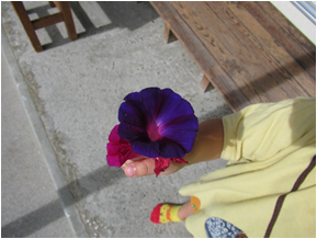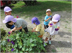 花壇に朝顔が咲き始め、「朝顔で色水したい!」「取りに行っていい?」とわくわくの子どもたちです。