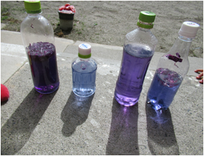 ・作った色水をペットボトルに入れ替えてみると色の違いが目で見て分かるるようになりました。