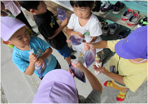 ・同じ朝顔の花で様々な色水ができて、子どもたちの驚きと喜びは大きかったです。