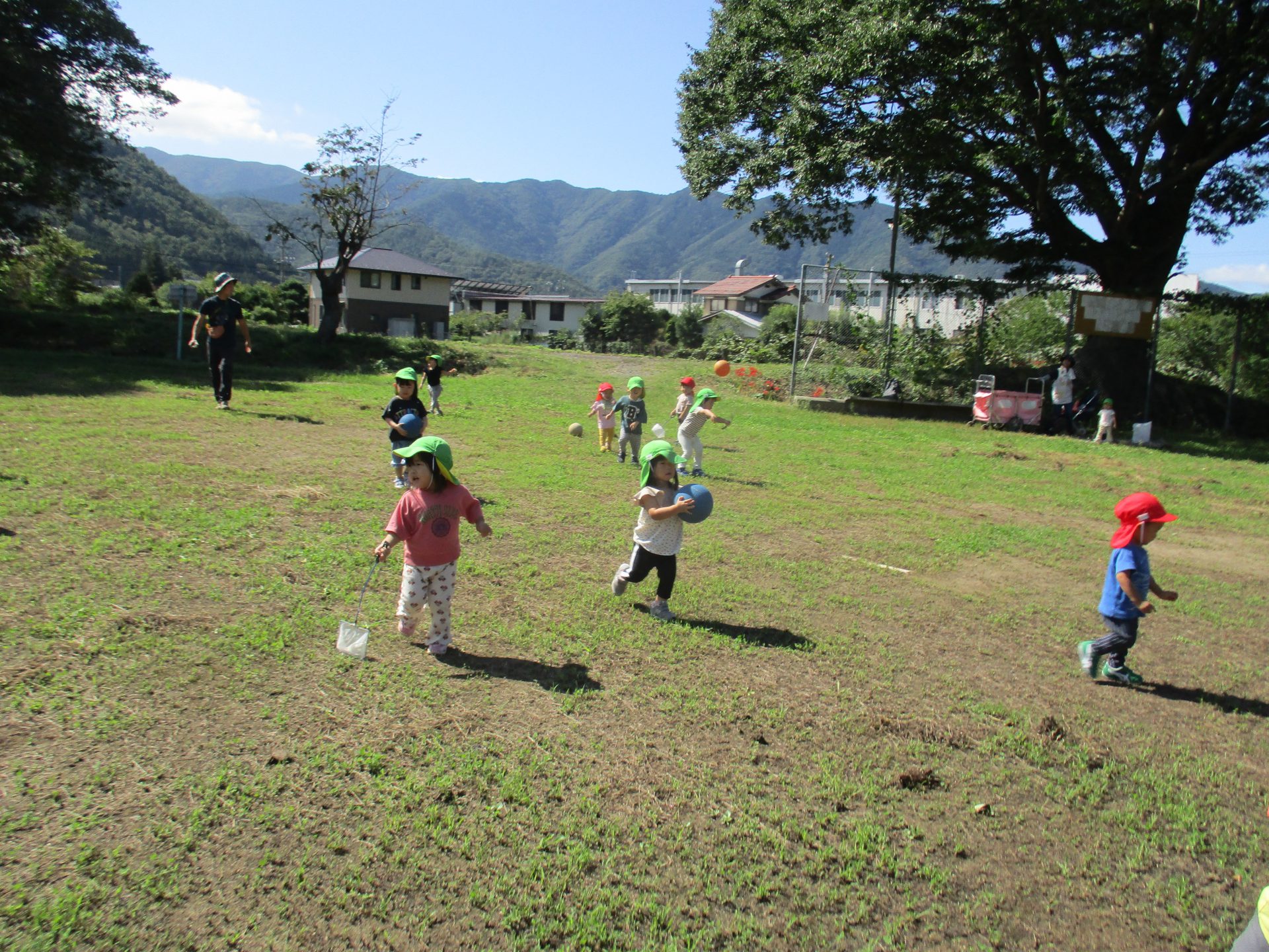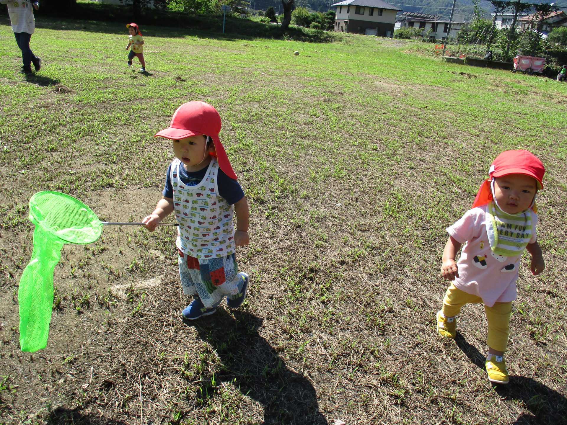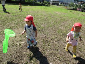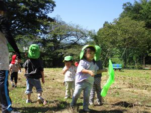 ・池田の宮のグランドにたくさんのトンボが飛んでいて、友達の帽子や保育士の手に留まっているよ。「いいなぁ。こっちにもきてくれないかな」
