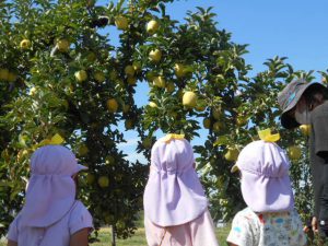 真島はリンゴの産地。「きいろのりんご!」「こっちはあかだよ」「おいしそうだな~」
