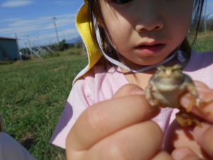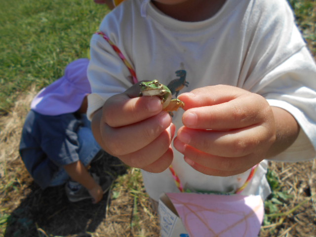 見て見て!大きいカエル。大きいからお母さんカエルかな?私も見つけたよ!