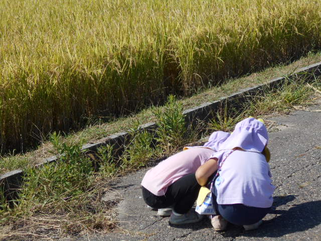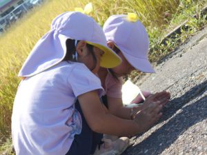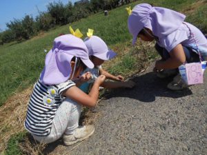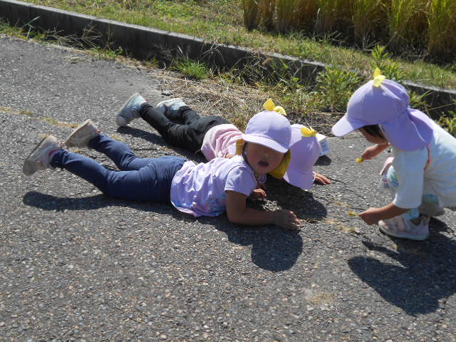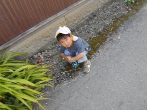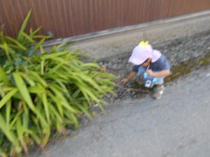 ・芋虫が潰れて、溝にはまっているのを見つけて「虫大丈夫かな~。かわいそうだね。あっ動いた!良かった~」
