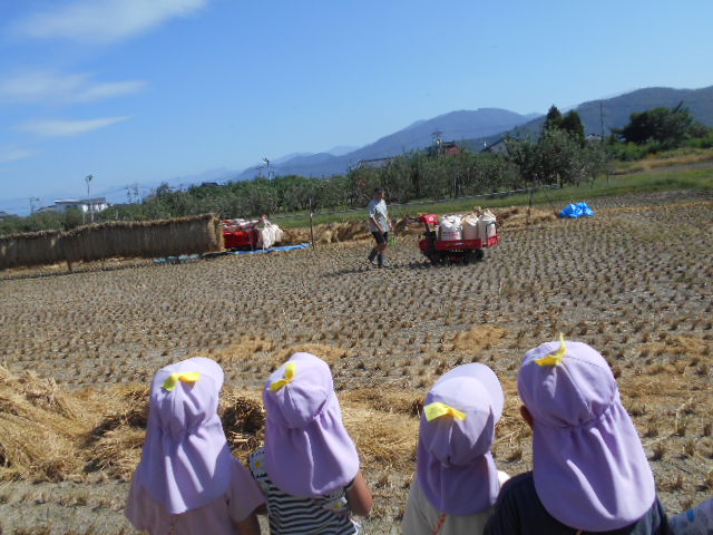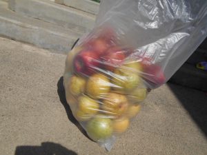 脱穀中の手を休めて、畑で梨とりんごを採ってくれました。