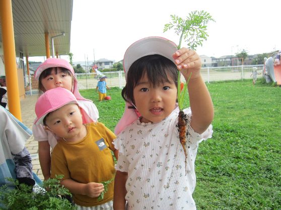 虫や草花、生き物などを見つけたり、触れたりすることが大好きな子ども達。大きい組さんの真似をしてプランターでのミニ人参作りに挑戦してみました。
